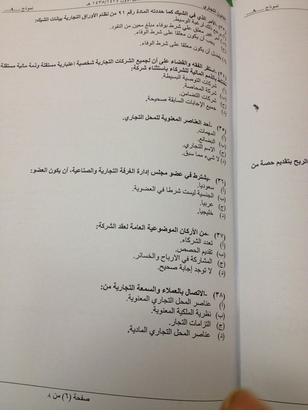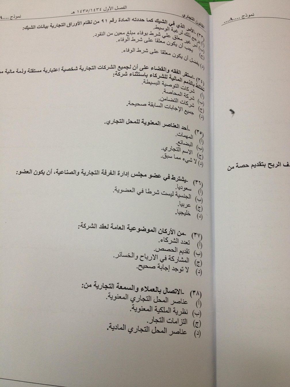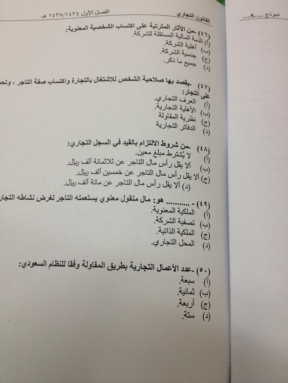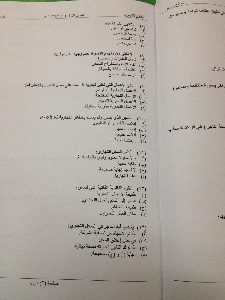 اسئلة اختبار مادة القانون التجاري الفصل الدراسي الأول 1435هـ نموذج (a)
