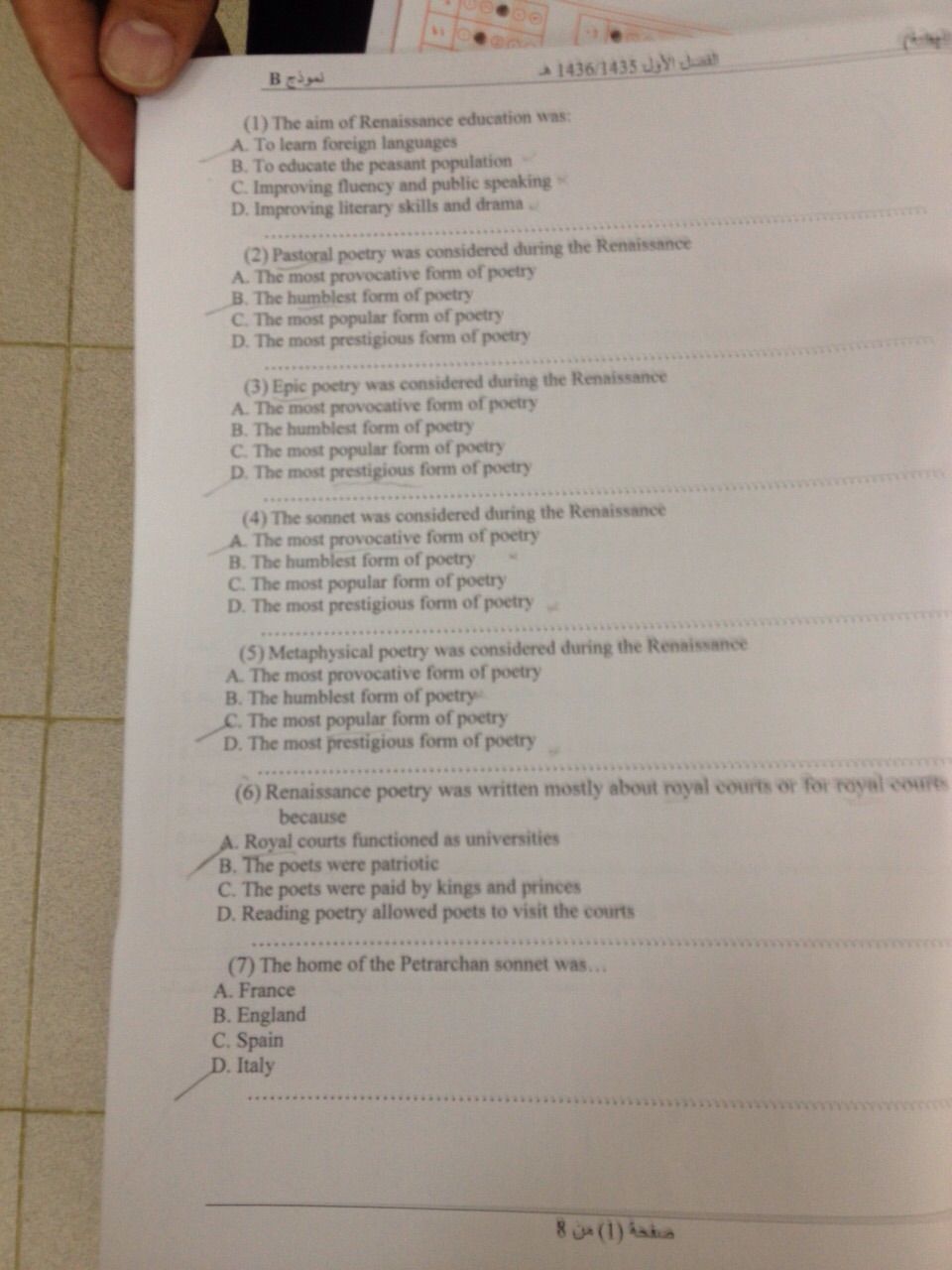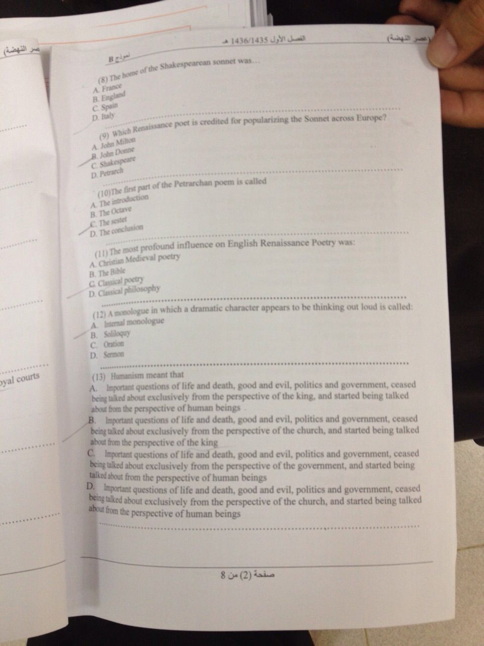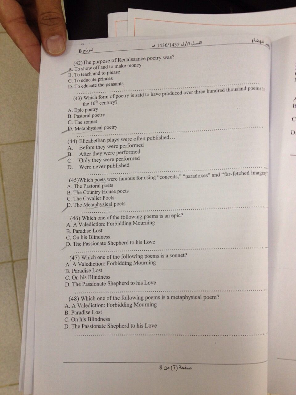 اسئلة اختبار الأدب الإنجليزي عصر النهضة الفصل الدراسي الأول 1436هـ نموذج (B)