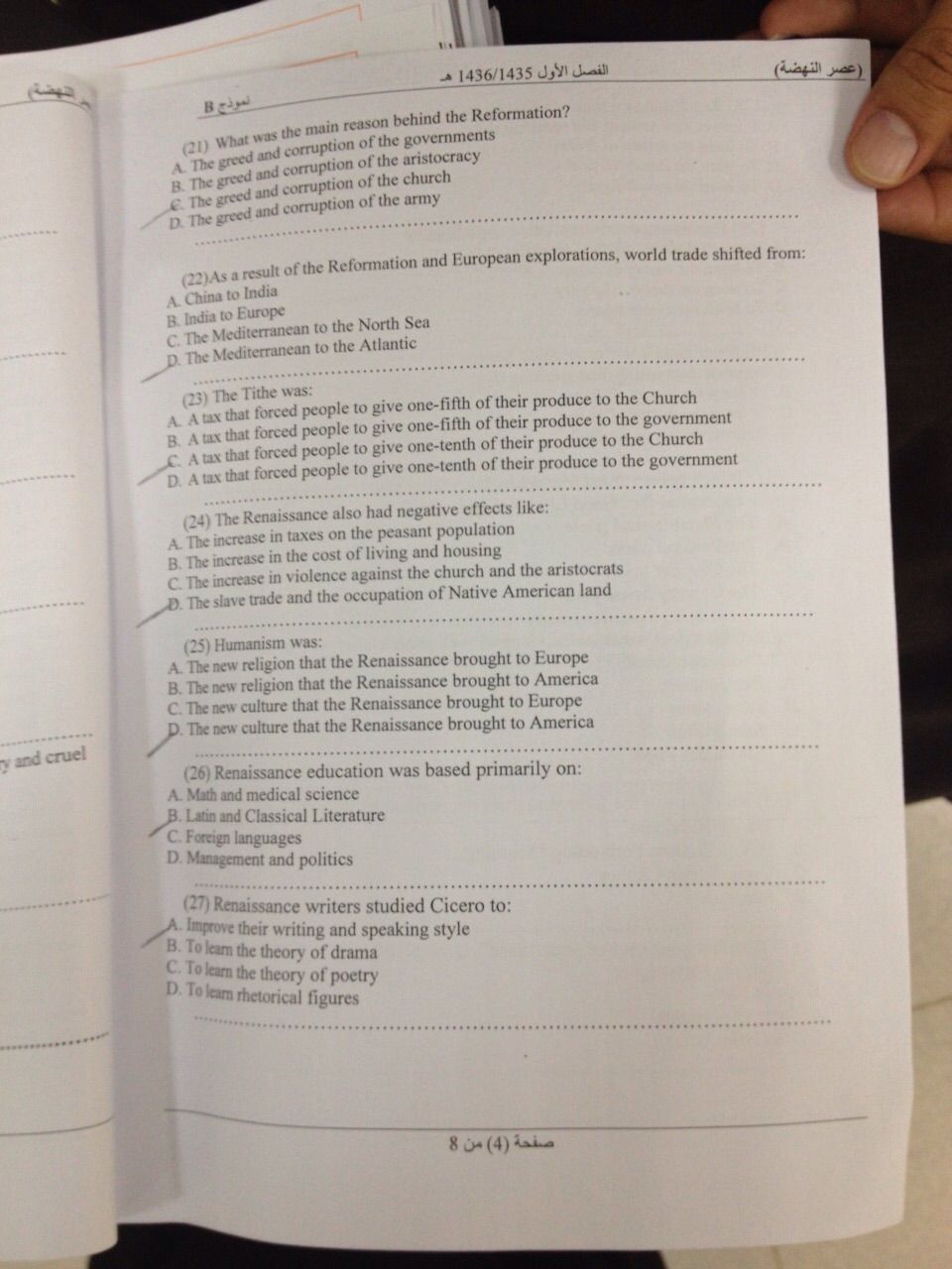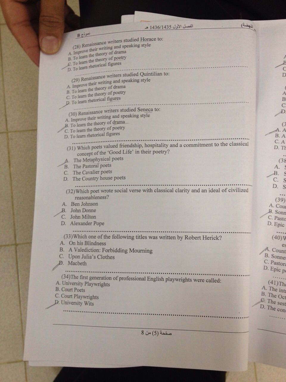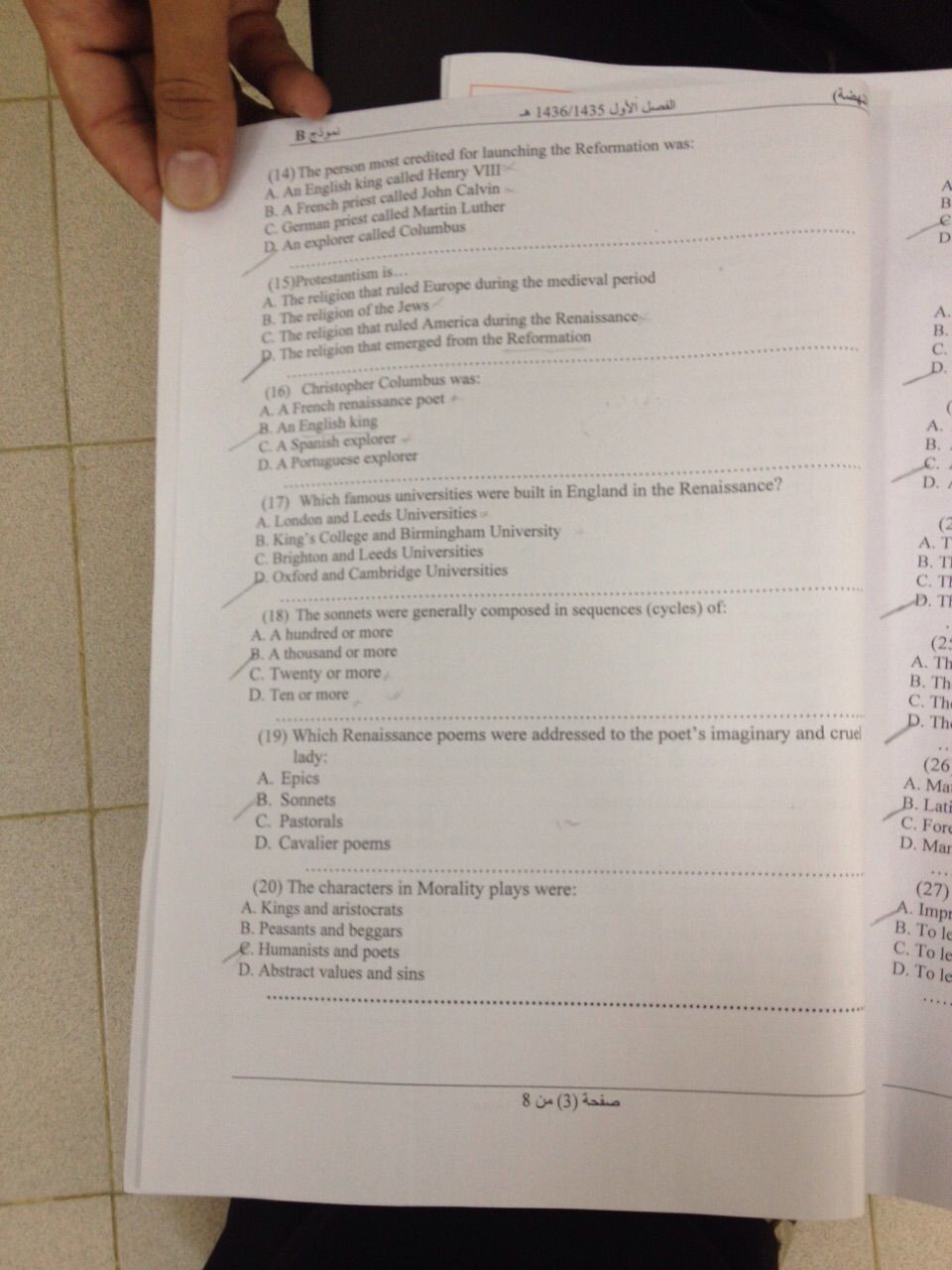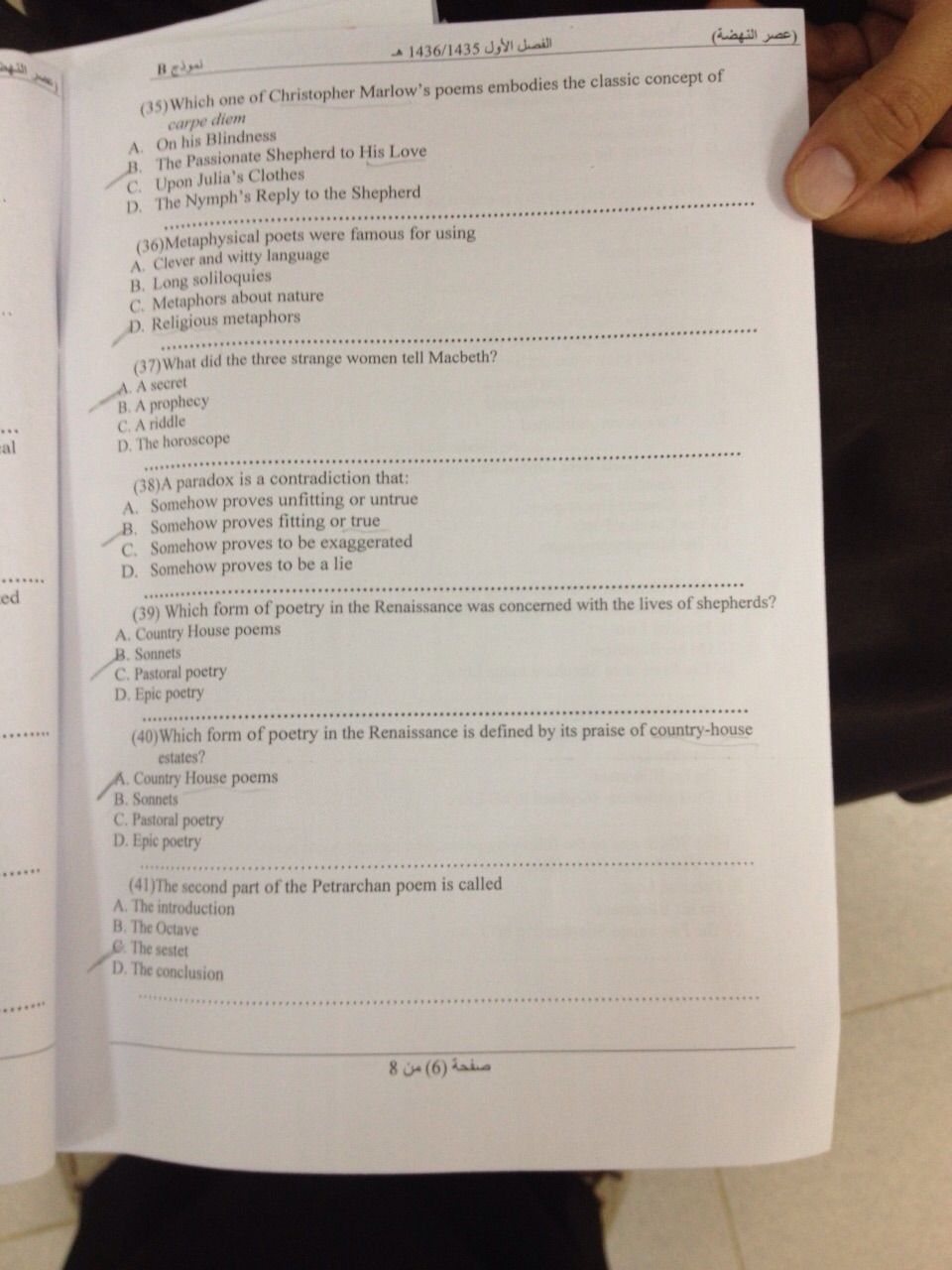 اسئلة اختبار الأدب الإنجليزي عصر النهضة الفصل الدراسي الأول 1436هـ نموذج (B)