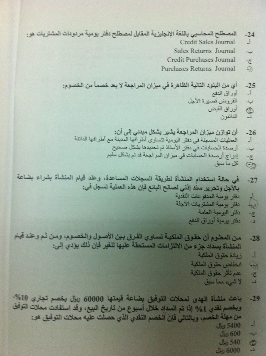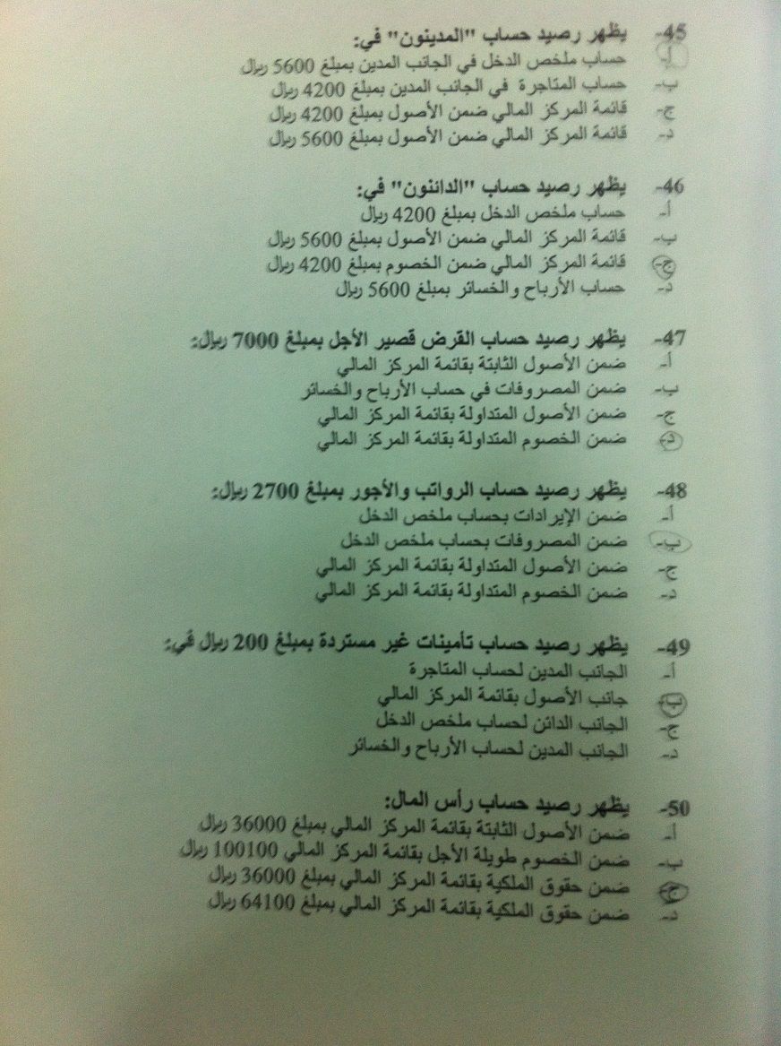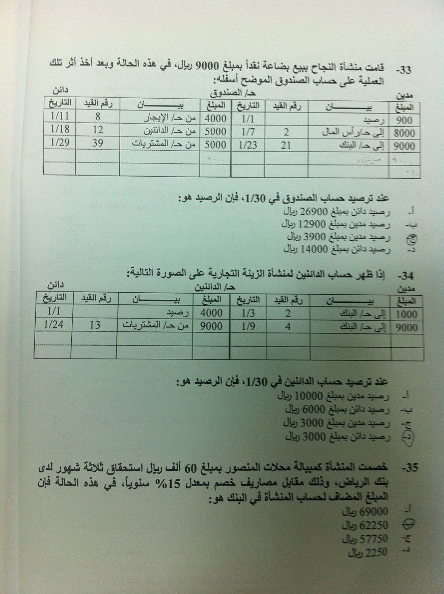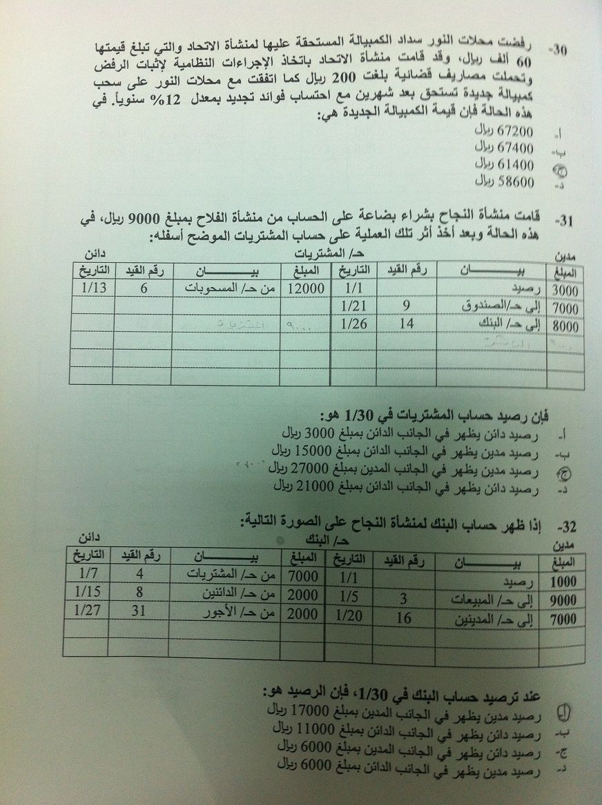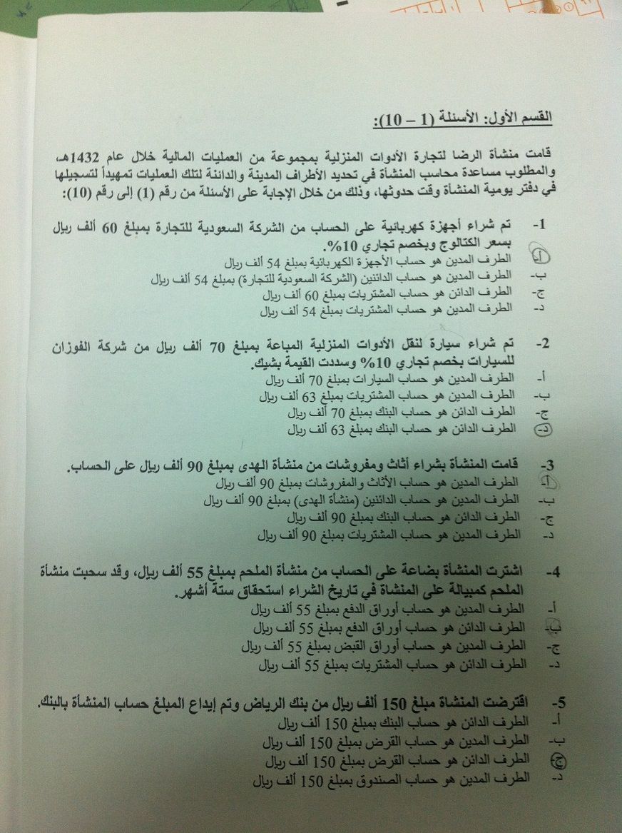 اسئلة اختبار مادة مبادئ المحاسبة 1 الفصل الدراسي الأول 1433هـ نموذج (d)