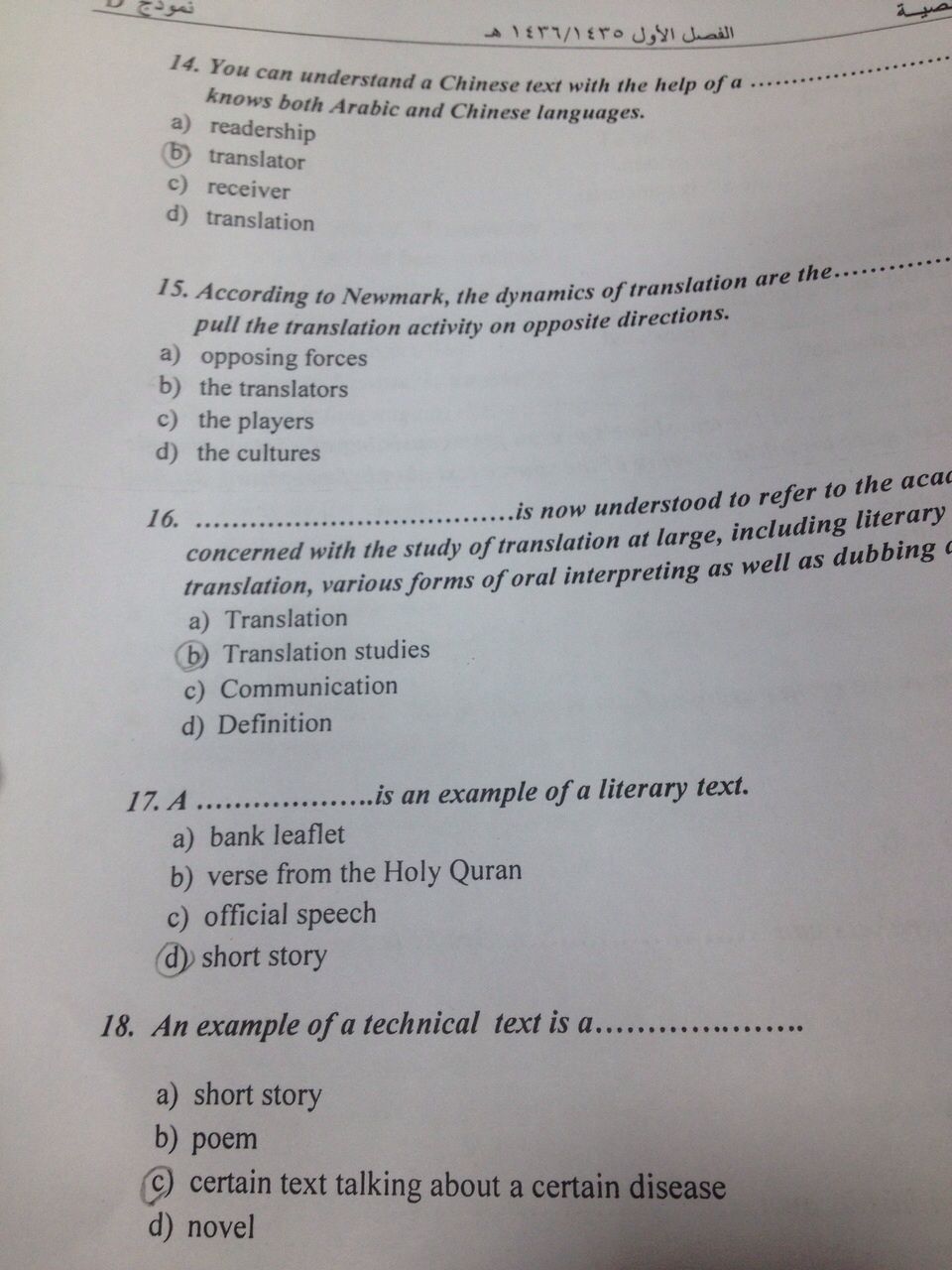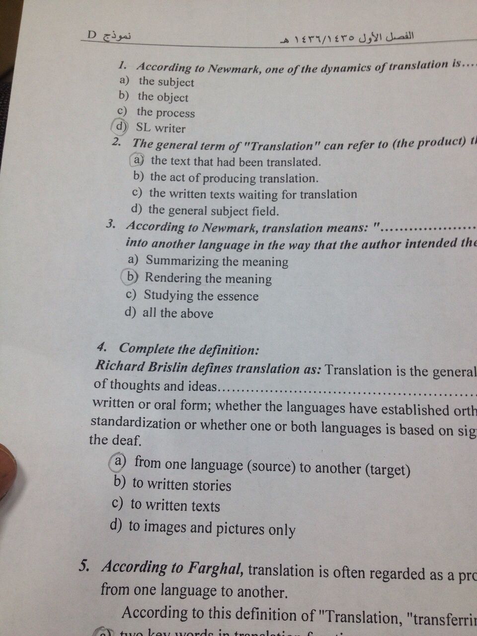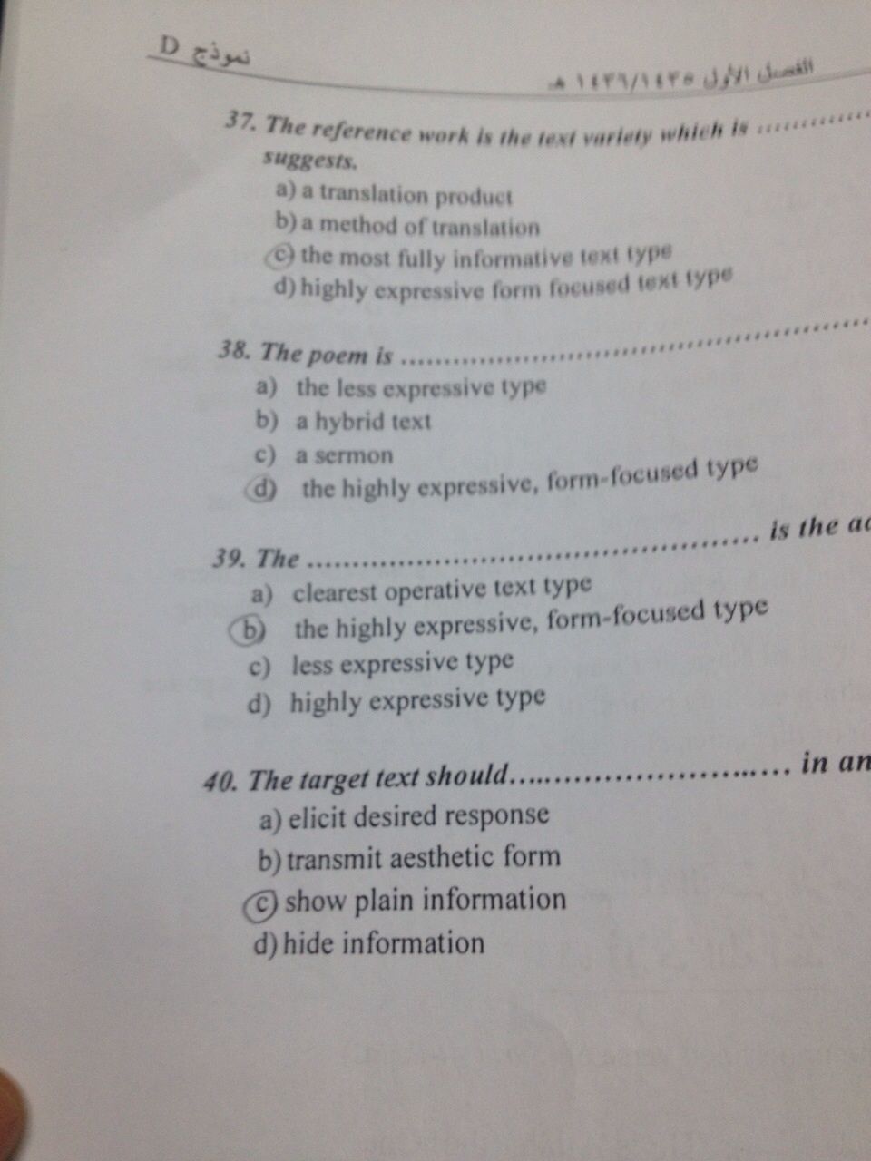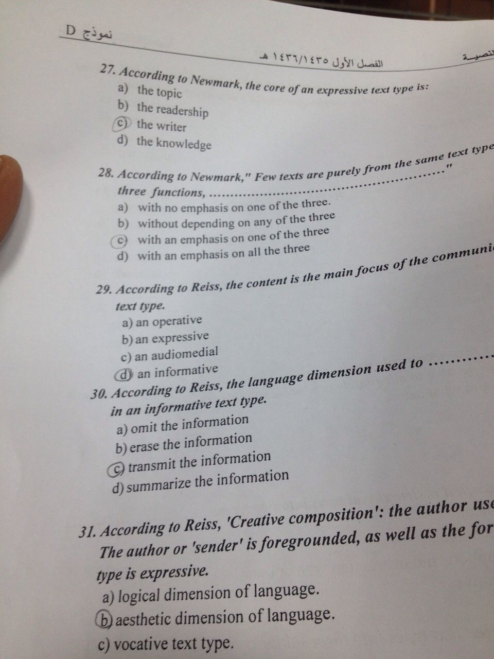 اسئلة اختبار ترجمة الأنماط النصية الفصل الأول 1436هـ نموذج (D)