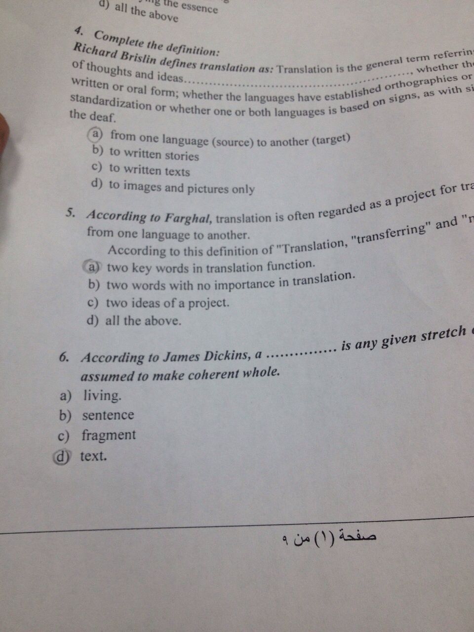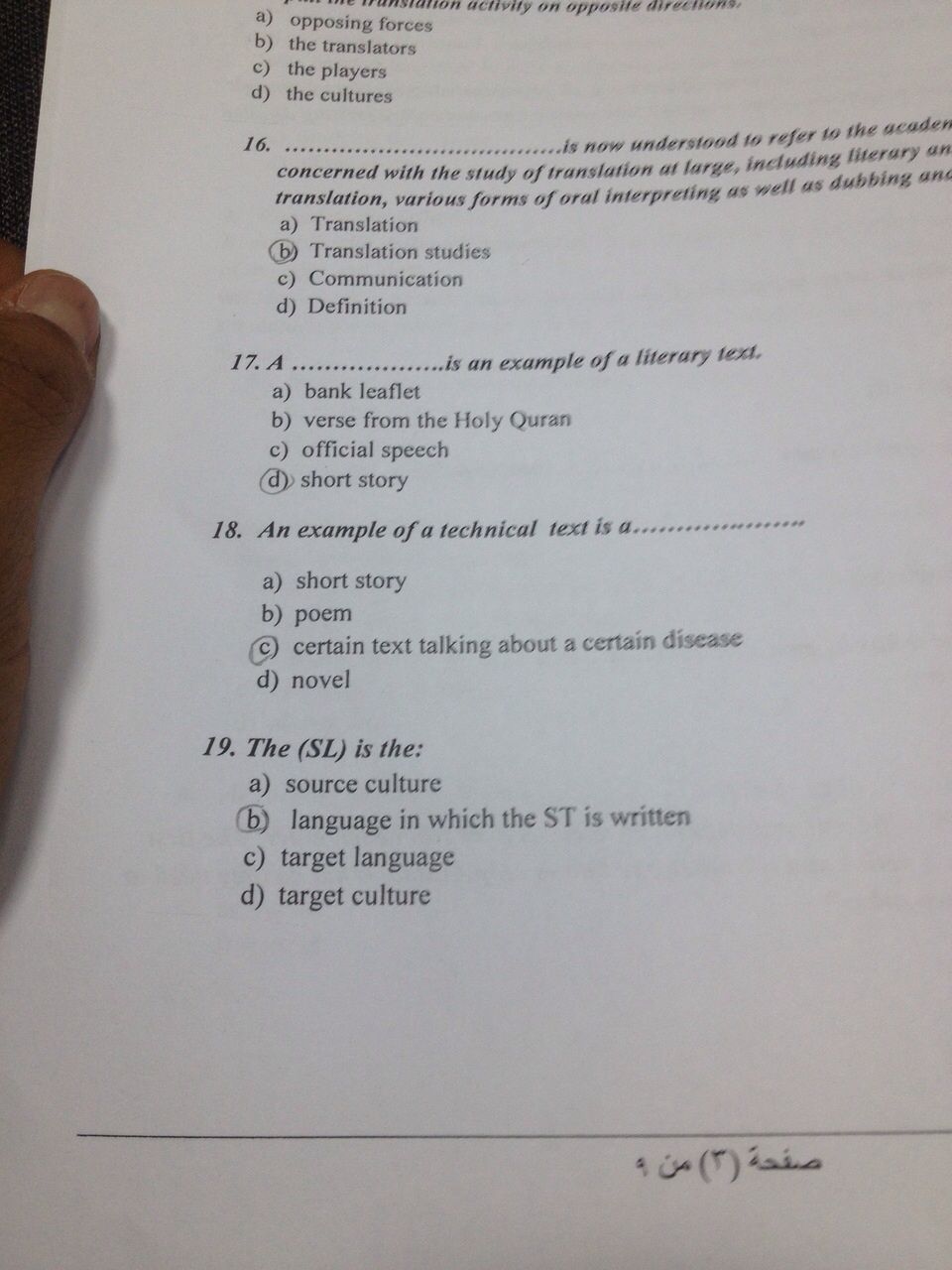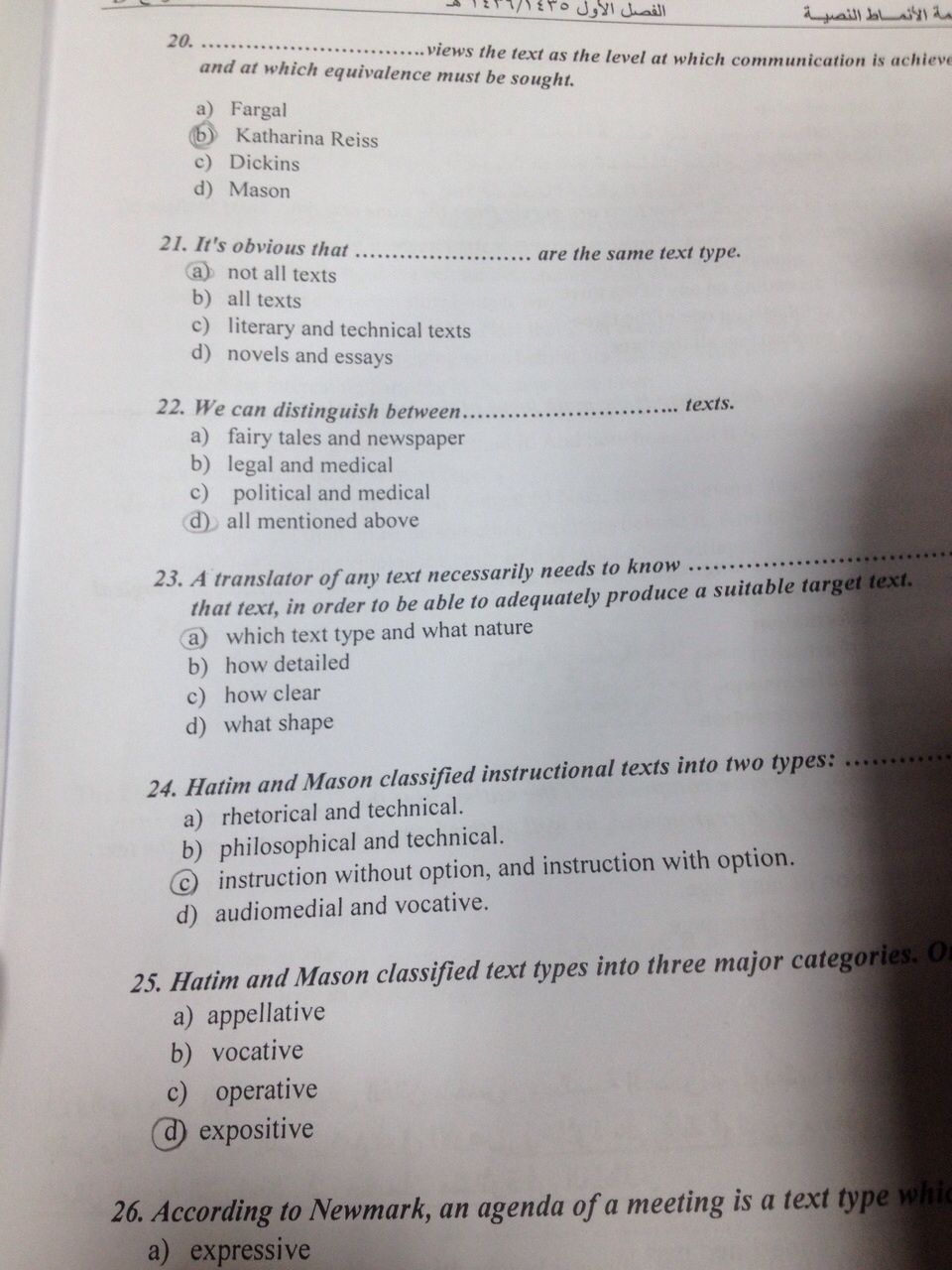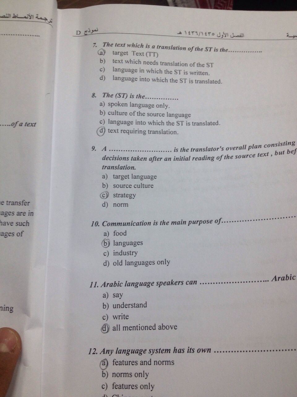 اسئلة اختبار ترجمة الأنماط النصية الفصل الأول 1436هـ نموذج (D)