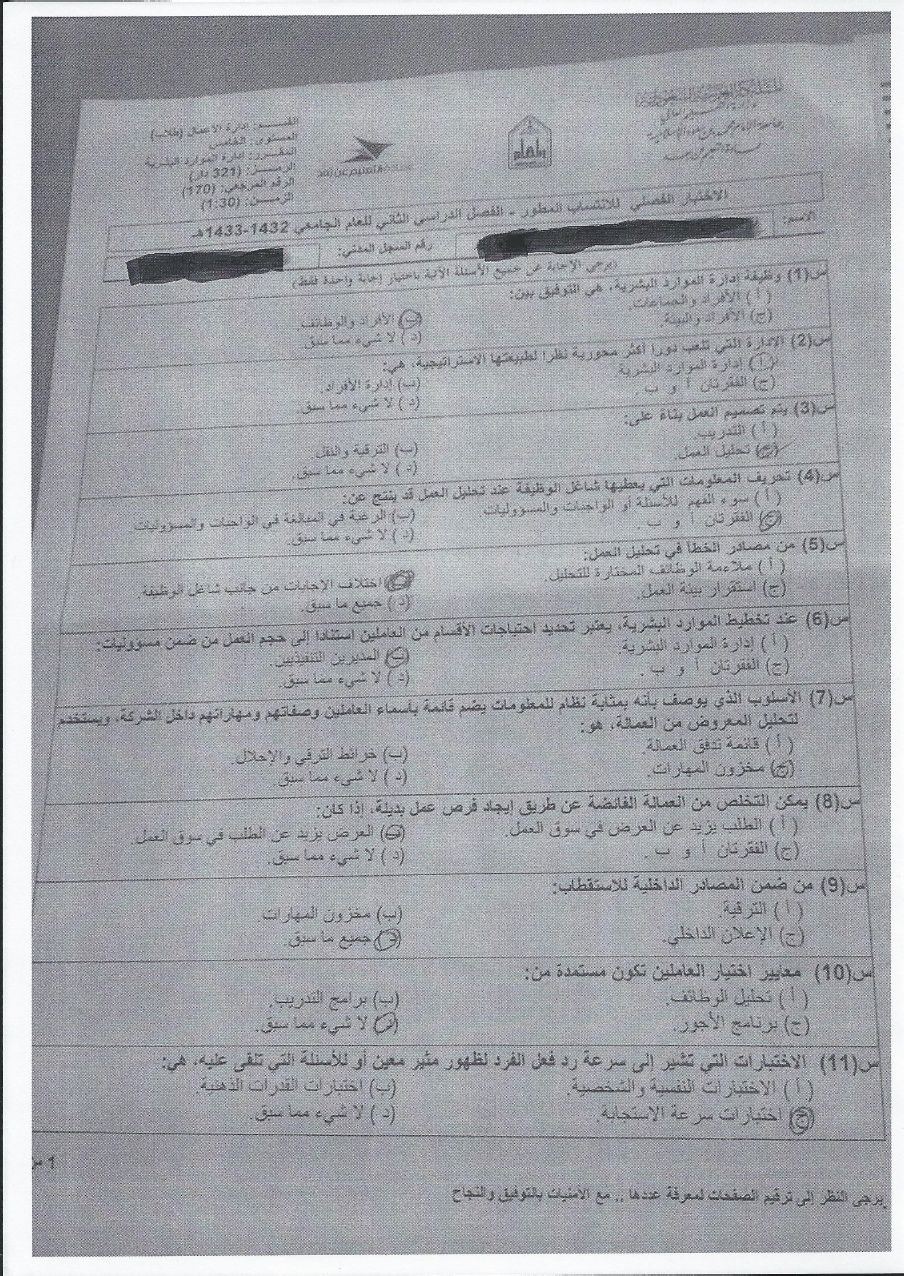 اسئلة مادة إدارة الموارد البشرية دار 321 للإنتساب المطور الفصل الدراسي الثاني 1433هـ