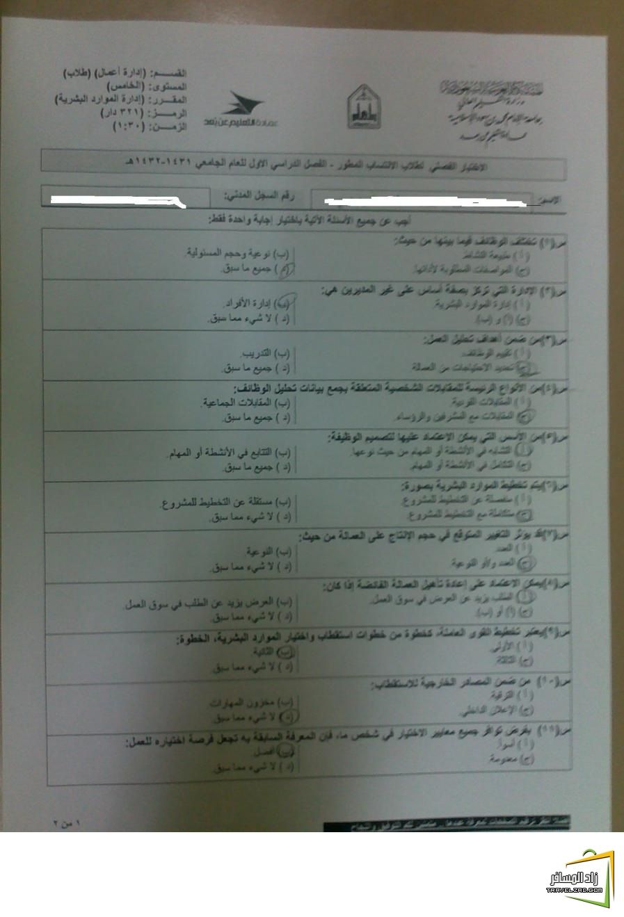 اسئلة مادة إدارة الموارد البشرية دار 321 للإنتساب المطور الفصل الدراسي الأول 1432هـ طلاب