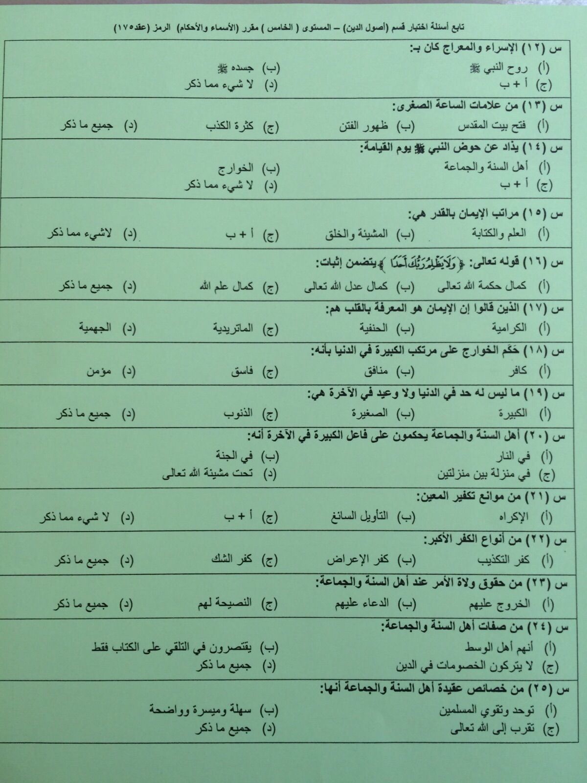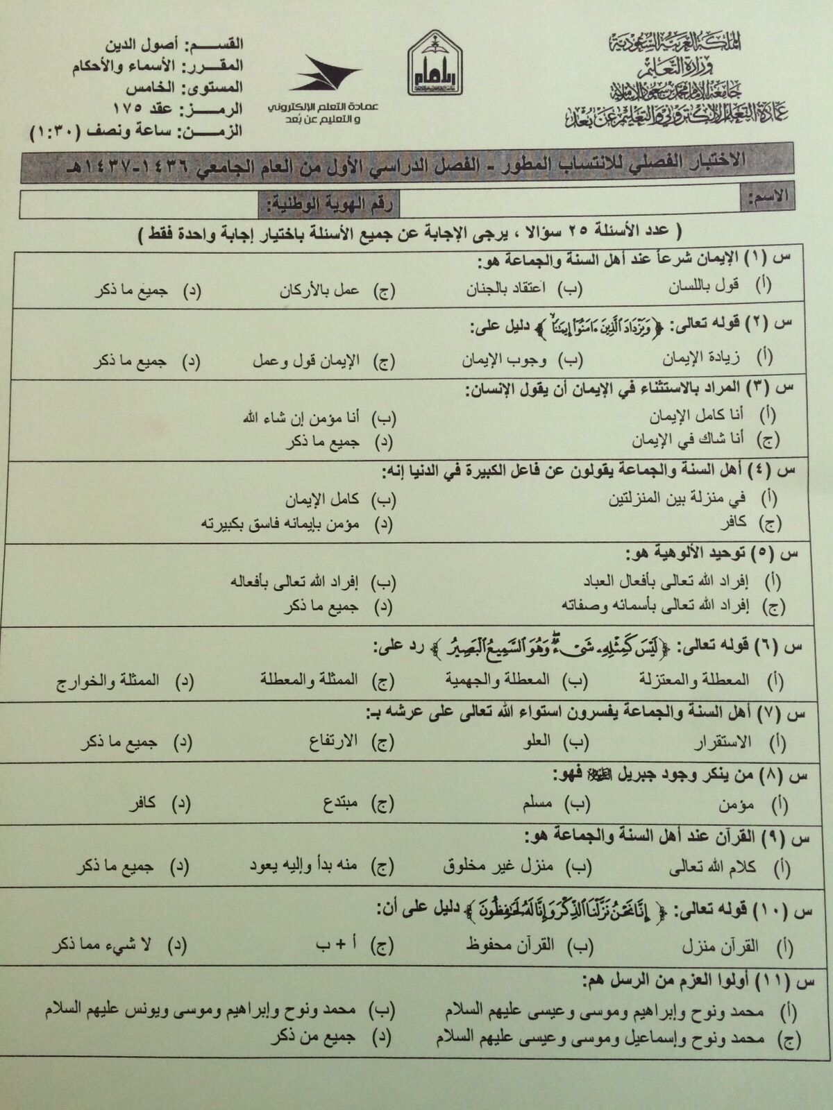 اختبار الأسماء والأحكام عقد 175 الفصل الأول 1437هـ المستوى الخامس أصول الدين