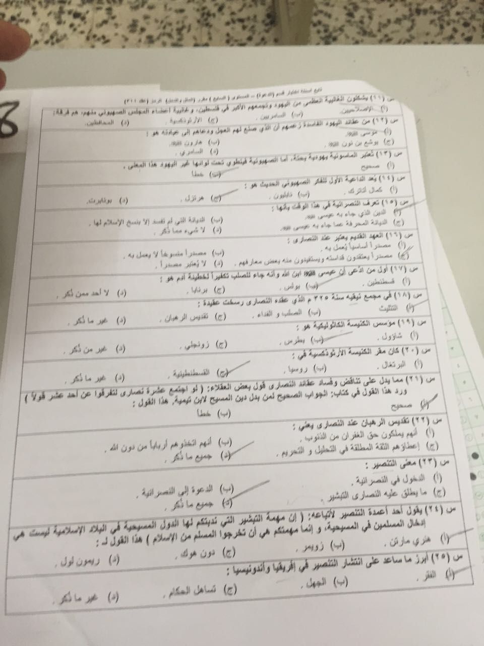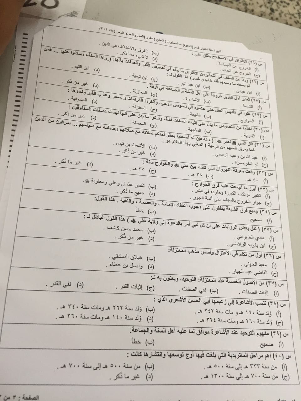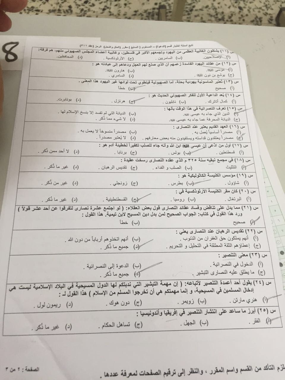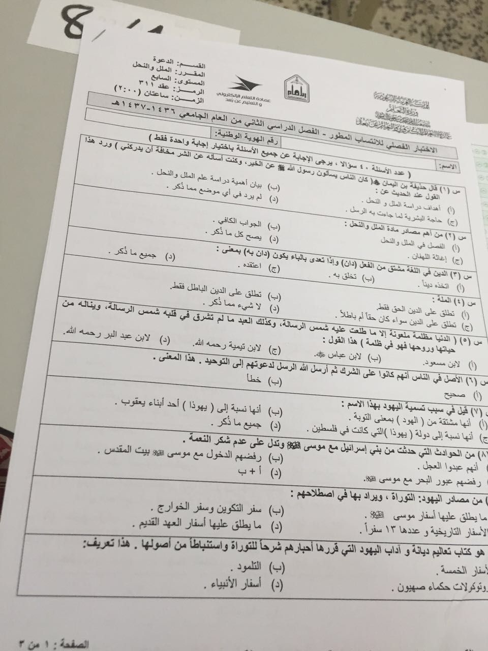 اختبار الملل والنحل عقد 311 الفصل الثاني 1437هـ
