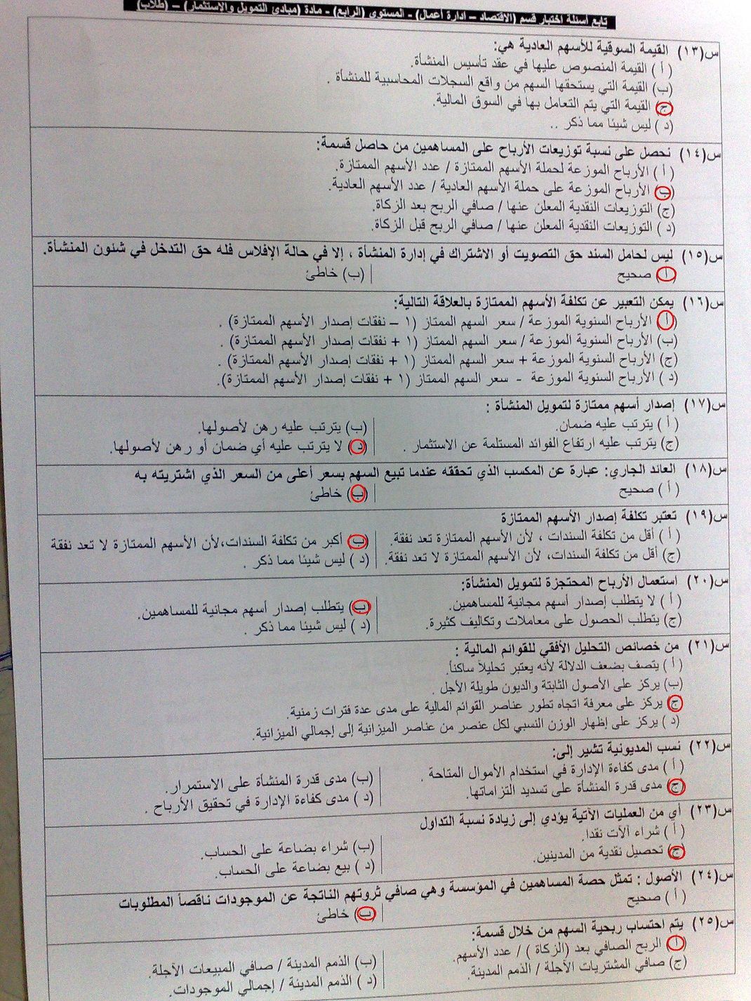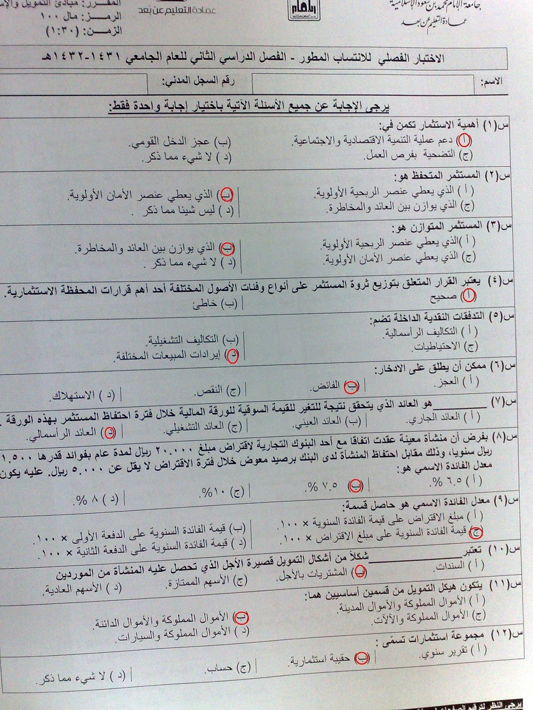 اسئلة مادة مبادئ التمويل والإستثمار مال 100 للإنتساب المطور الفصل الدراسي الثاني 1432هـ طلاب