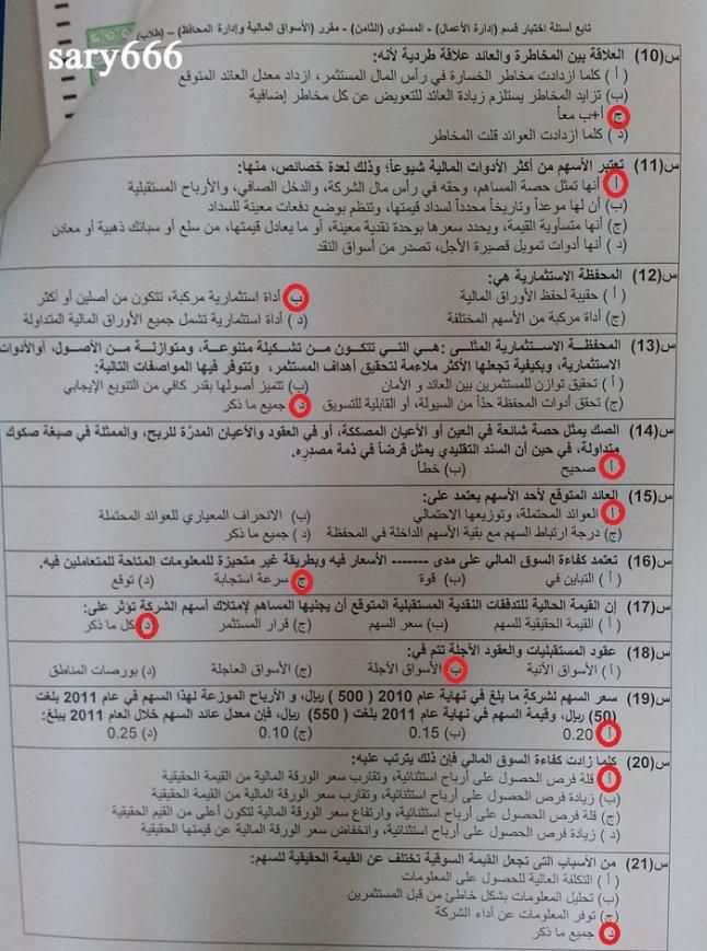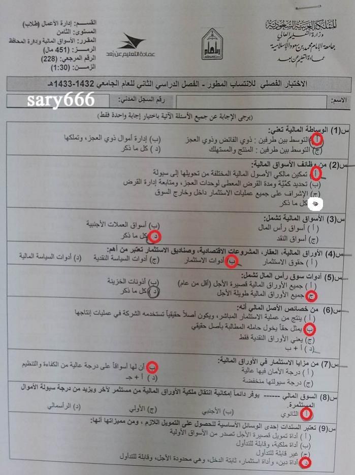 اسئلة مادة الأسواق المالية وإدارة المحافظ مال 451 للإنتساب المطور الفصل الدراسي الثاني 1433هـ طلاب