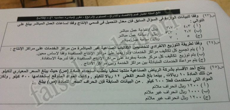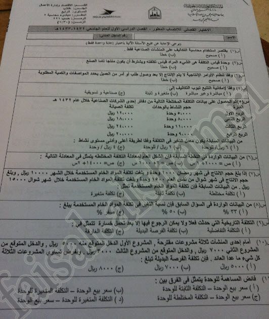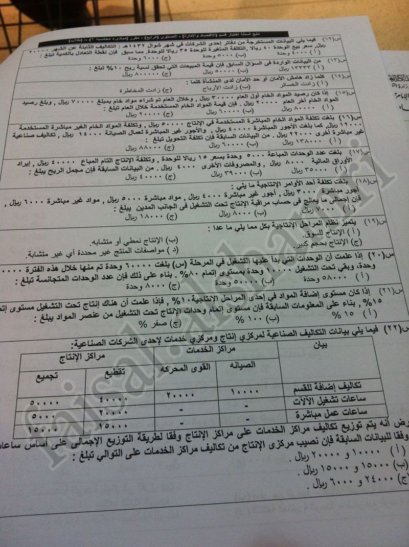 اسئلة اختبار مبادئ المحاسبة 2 حسب 221 الفصل الأول 1433هـ المستوى الرابع اقتصاد وإدارة الأعمال