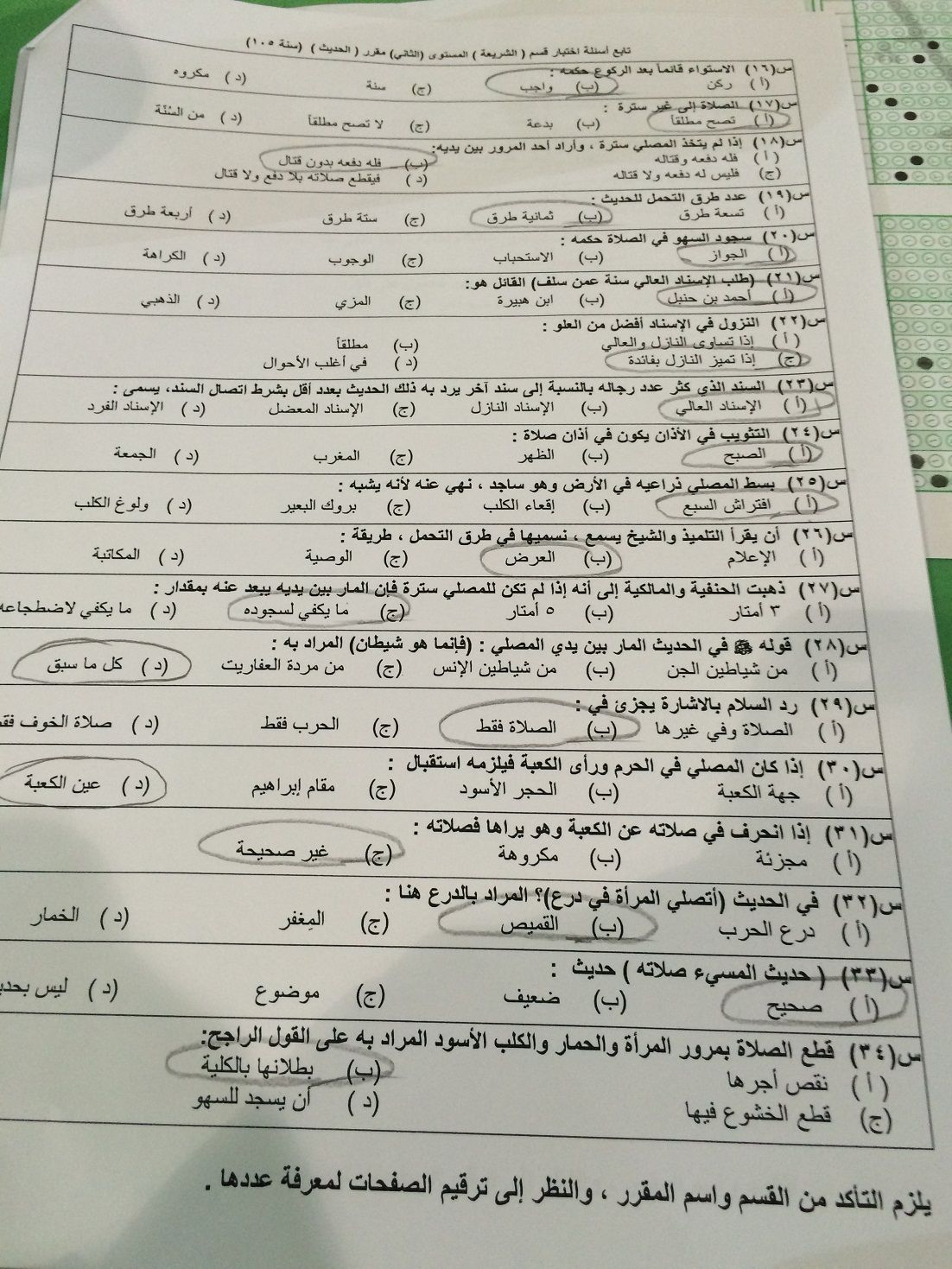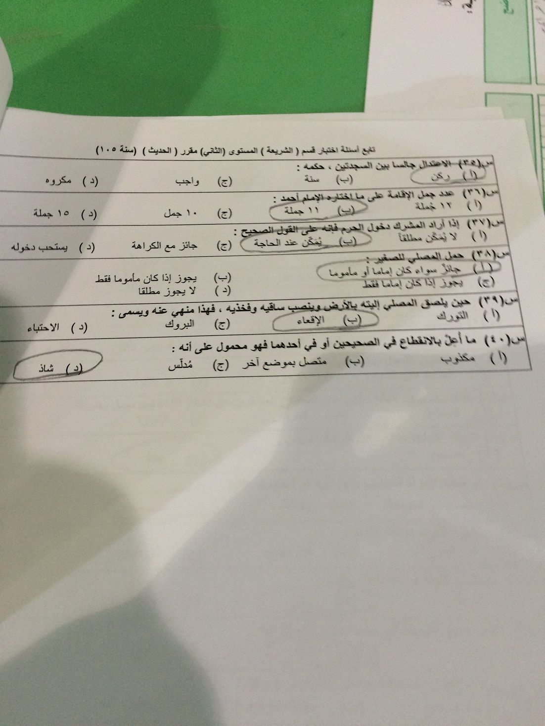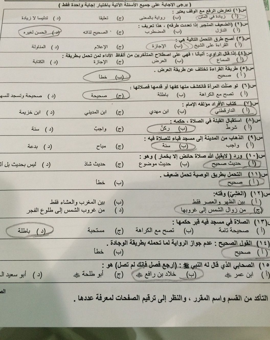 اسئلة اختبار الحديث سنة 105 انتساب الفصل الدراسي الأول 1436هـ