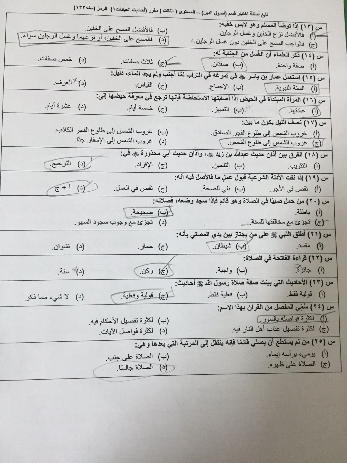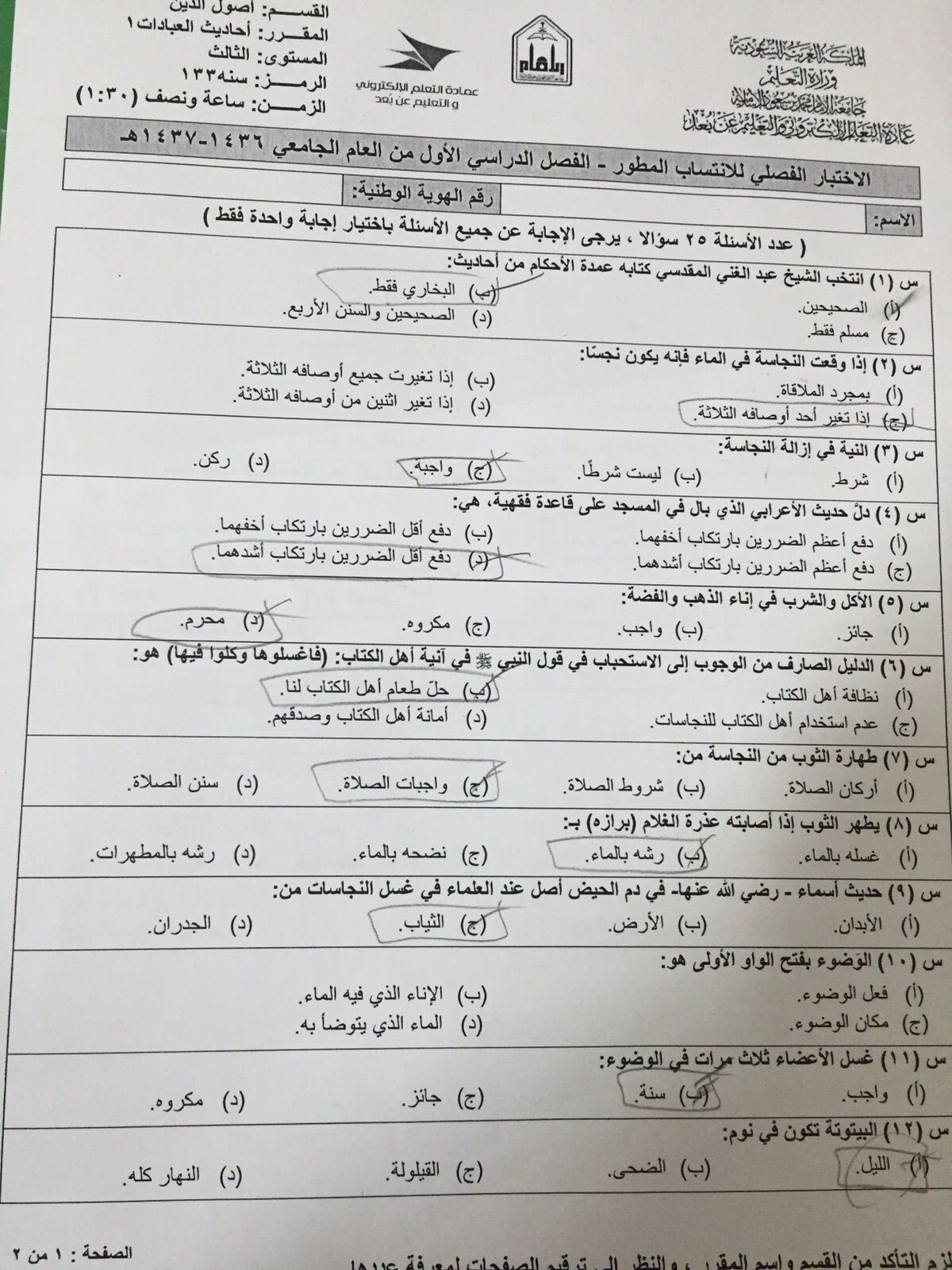 اختبار أحاديث العبادات 1 سنة 133 الفصل الأول 1437هـ المستوى الثالث أصول الدين