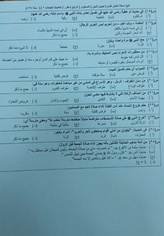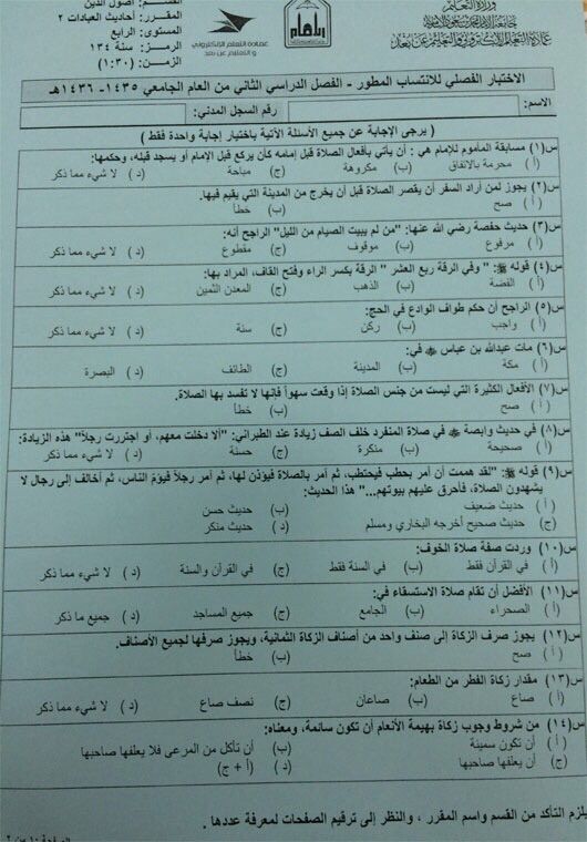 اختبار أحاديث العبادات 2 سنة 134 الفصل الثاني 1436هـ المستوى الرابع أصول الدين