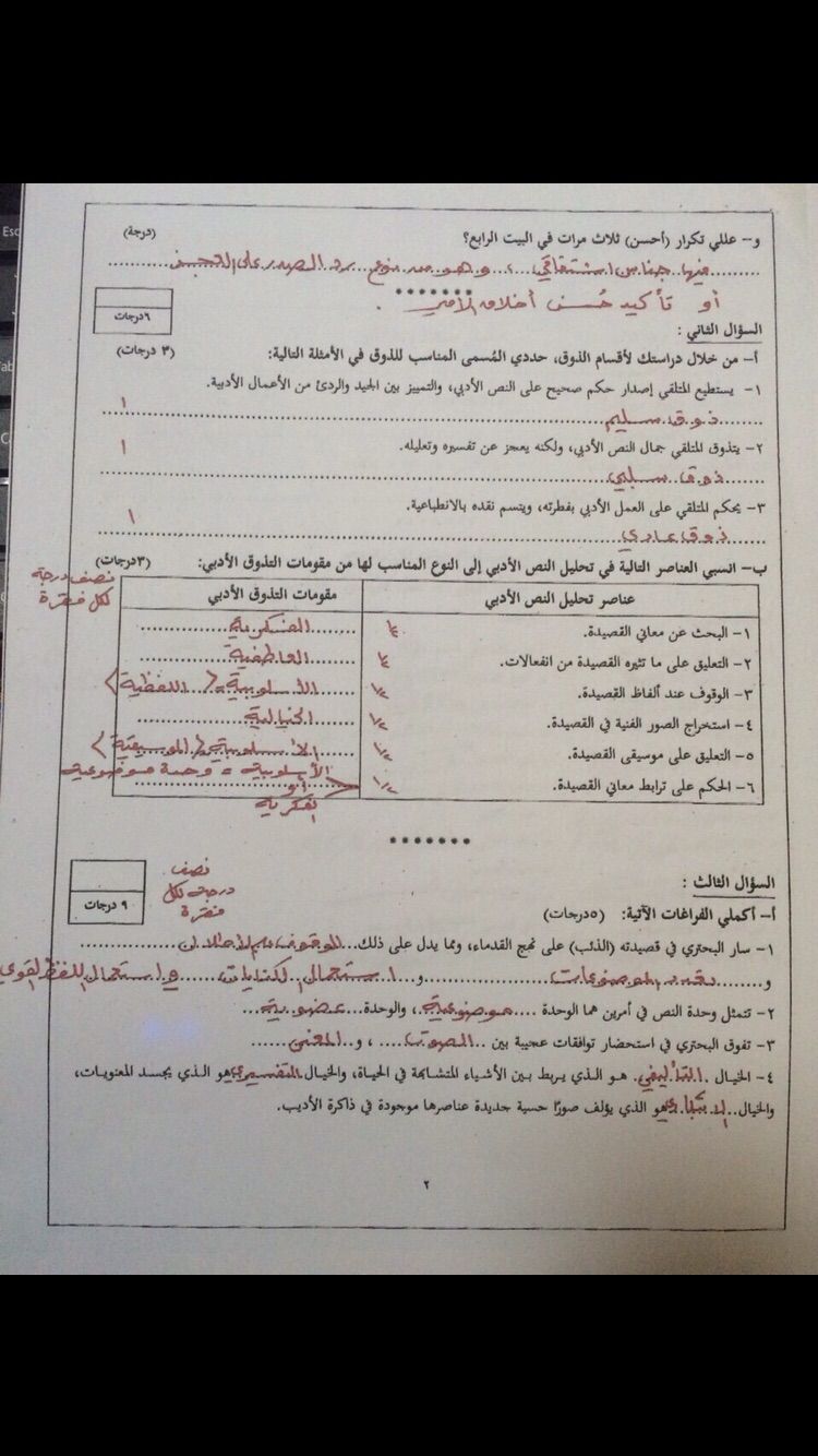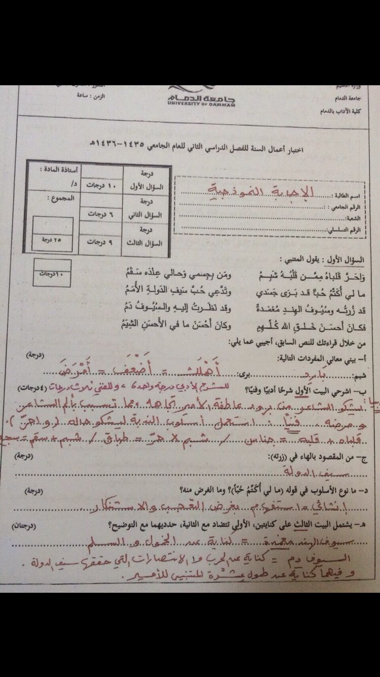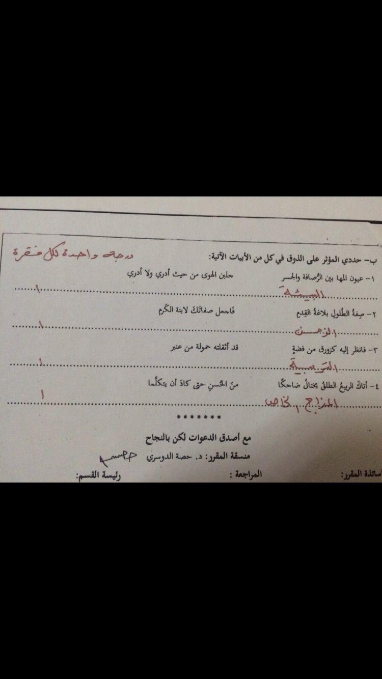 اسئلة اختبار التذوق الأدبي الفصل الثاني 1436هـ طالبات