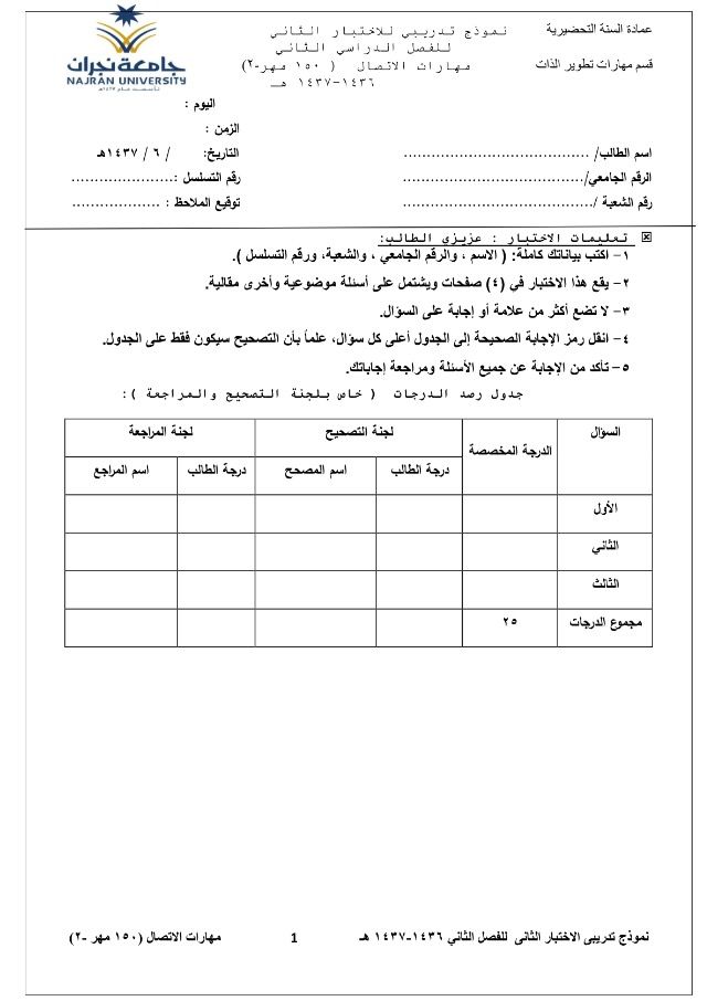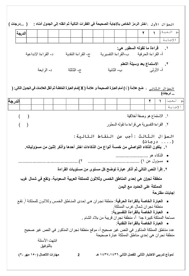 الاختبار الفصلي الثاني مهارات الاتصال 150 مهر 2 الفصل الثاني 1437هـ