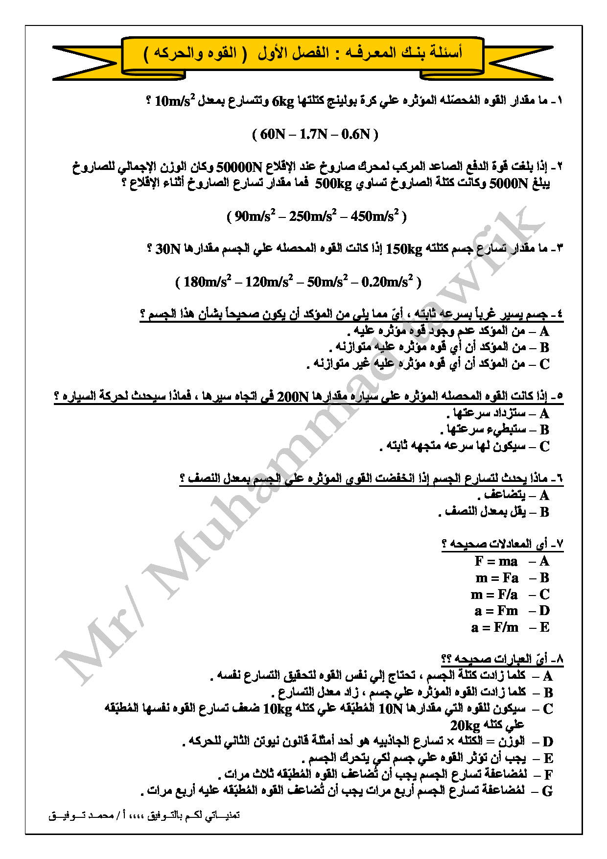 امتحان فيزياء نموذجي للصف الأول الثانوي الترم الثاني