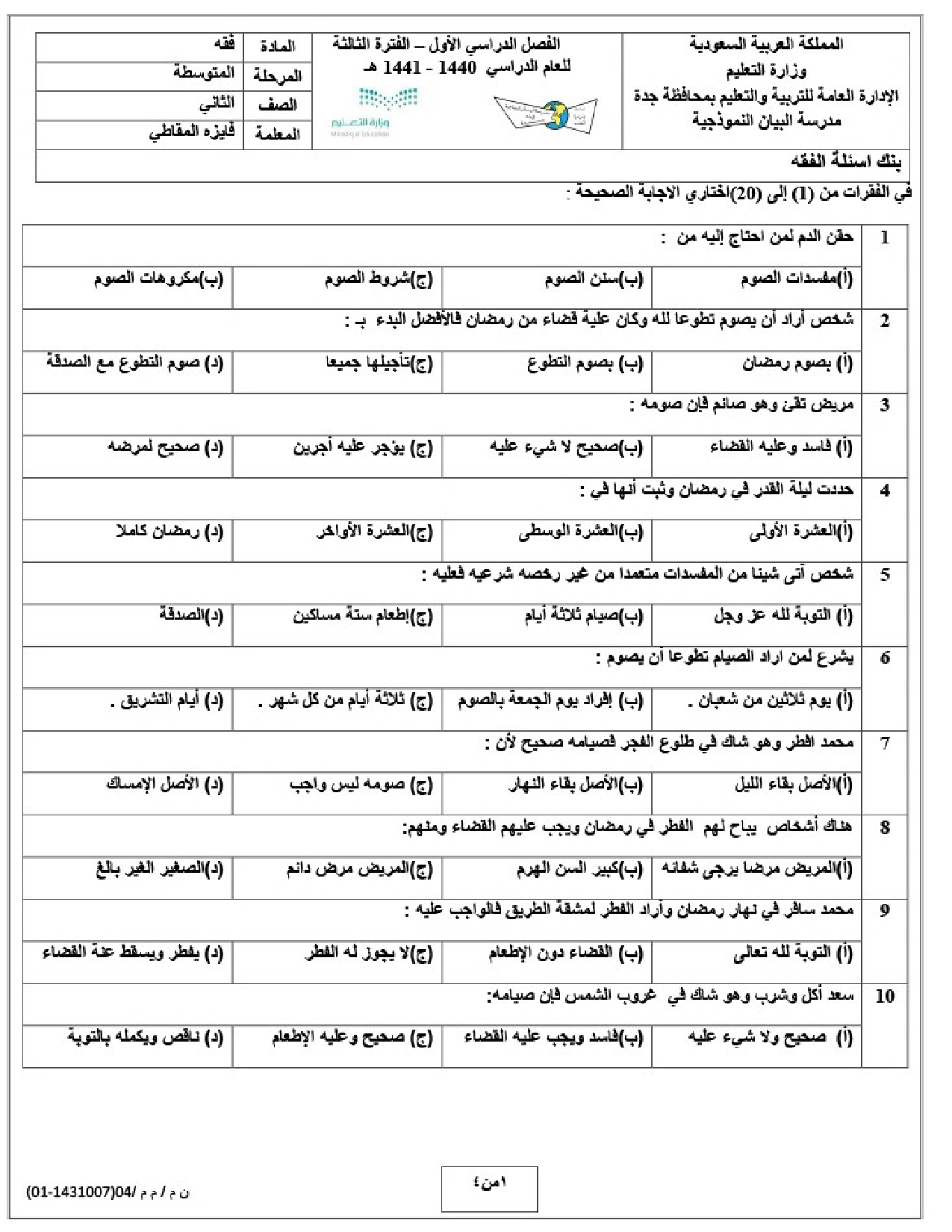 اختبار التربية الاسلامة الفقه - الثاني متوسط الفصل الدراسي الثاني الدور الثاني