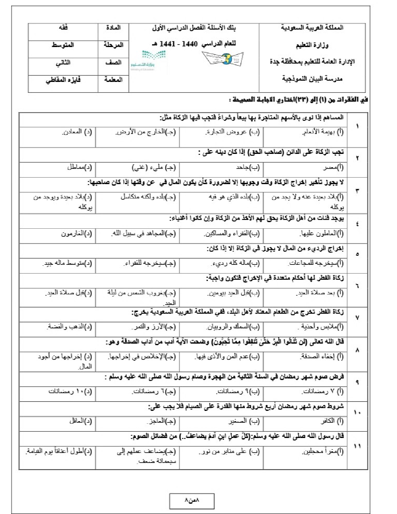 نموذج اختبار التربية الاسلامة- الفقه للصف الثاني متوسط الفصل الثاني