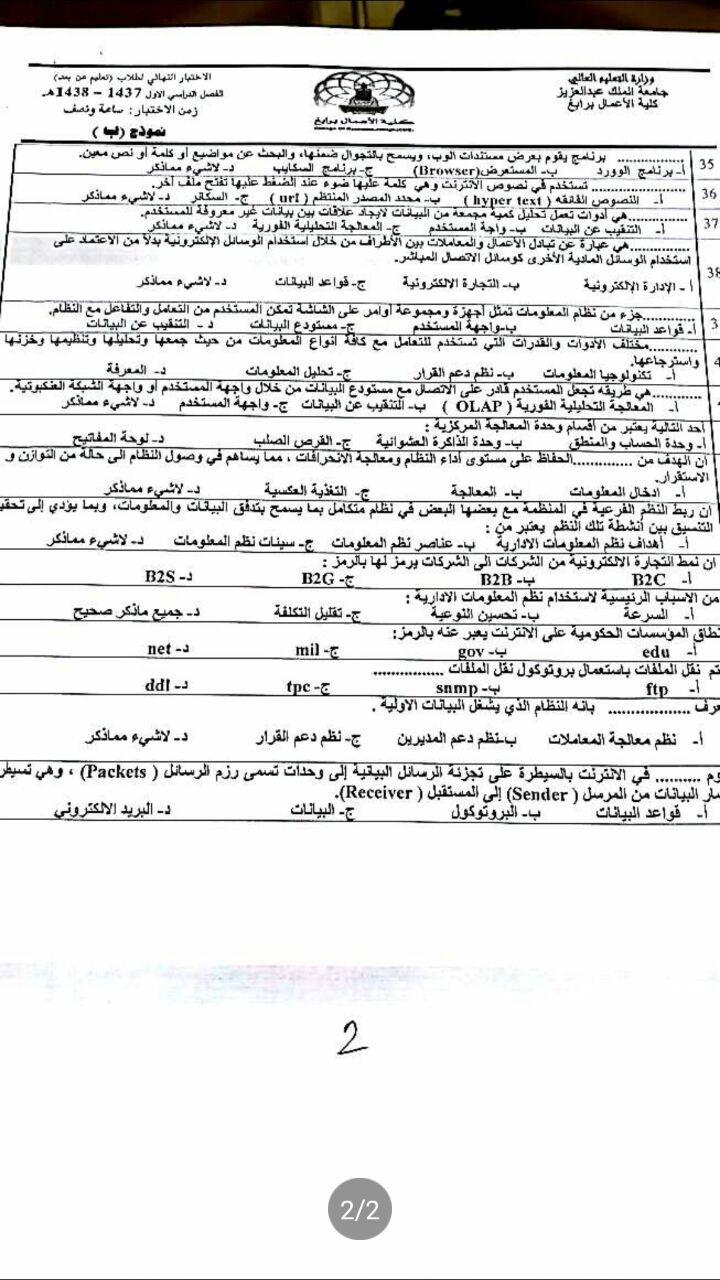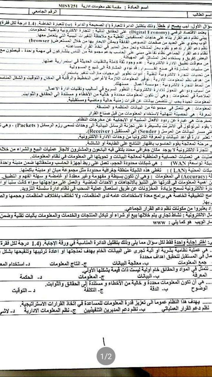 اسئلة الاختبار النهائي لمادة مقدمة في نظم المعلومات الإدارية MISY 251 عن بعد الفصل الأول 1437هـ 1438هـ نموذج ب