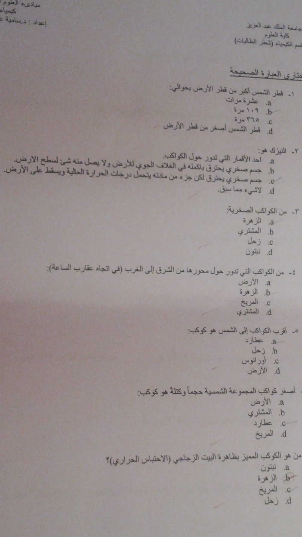 نماذج اختبارات مادة مقدمة في العلوم الطبيعية chem 205 انتساب