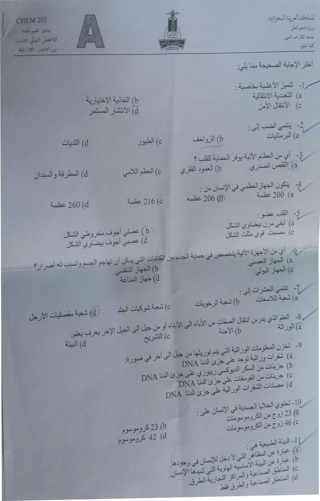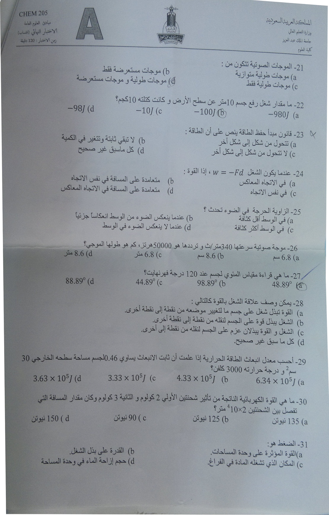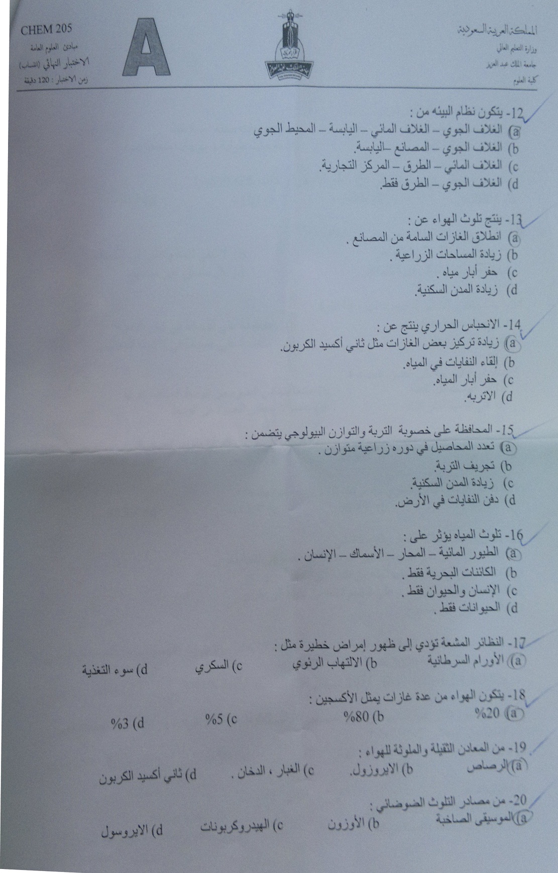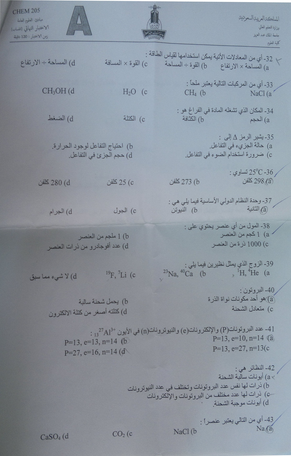 اسئلة اختبار مادة مبادئ العلوم العامة chem 205 انتساب 1433هـ نموذج (a)
