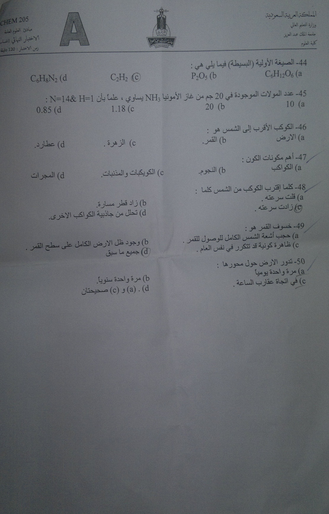 اسئلة اختبار مادة مقدمة في العلوم الطبيعية chem 205 انتساب 1433هـ نموذج (a)