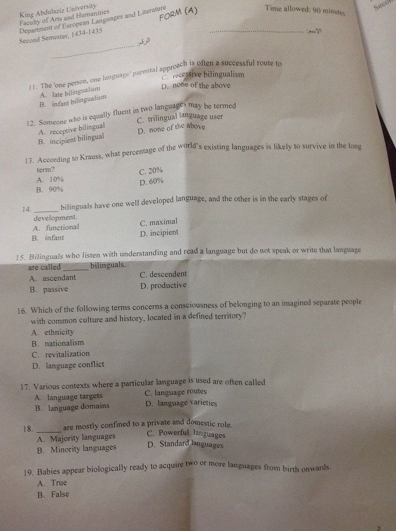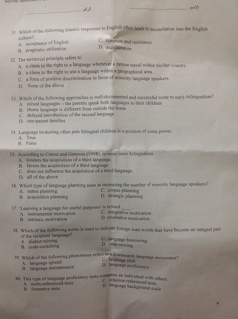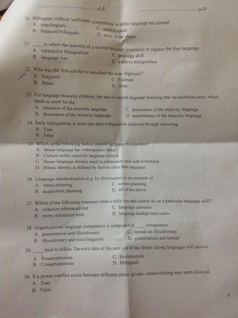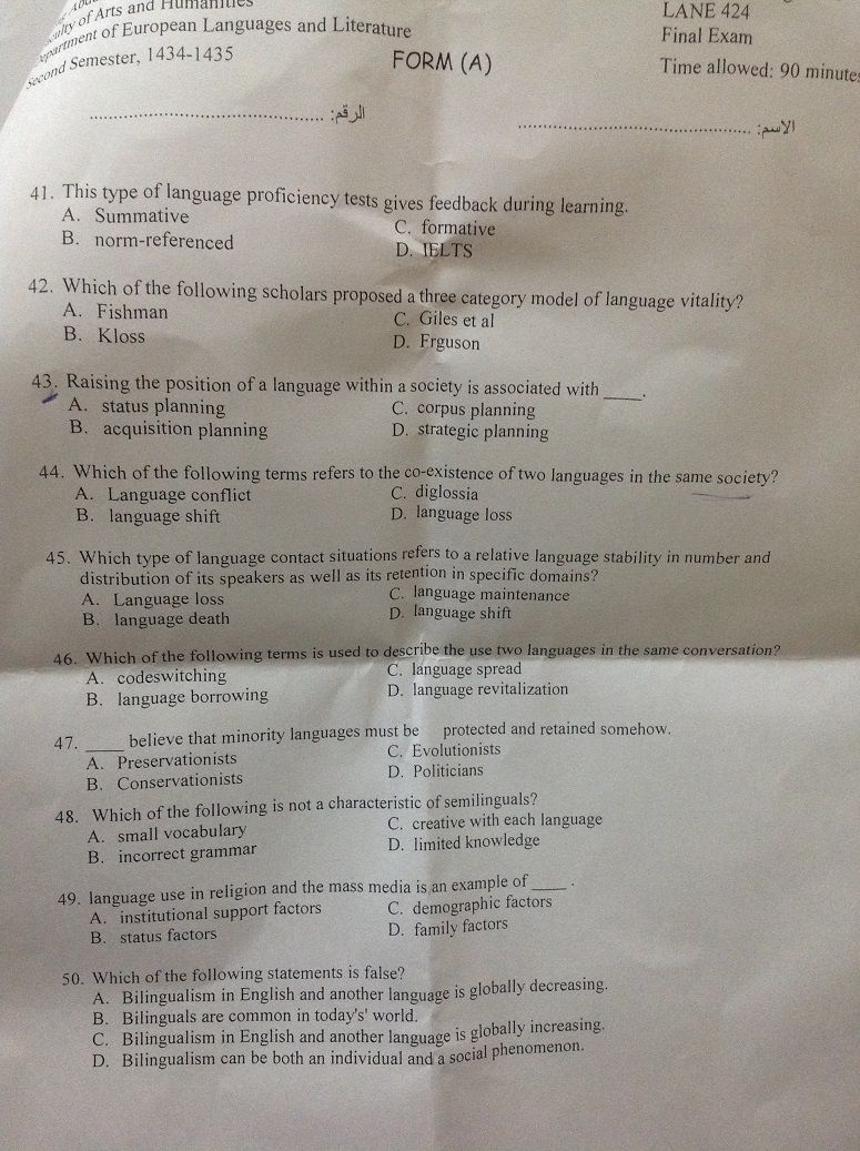 اسئلة مادة حلقة بحث في اللغويات lane 424 انتساب مناطق الفصل الدراسي الثاني 1435هـ نموذج (a)