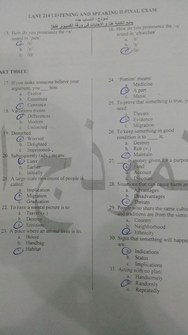 اسئلة اختبار الاستماع والتحدث lane 214 انتساب الفصل الثاني 1436هـ نموذج (أ)