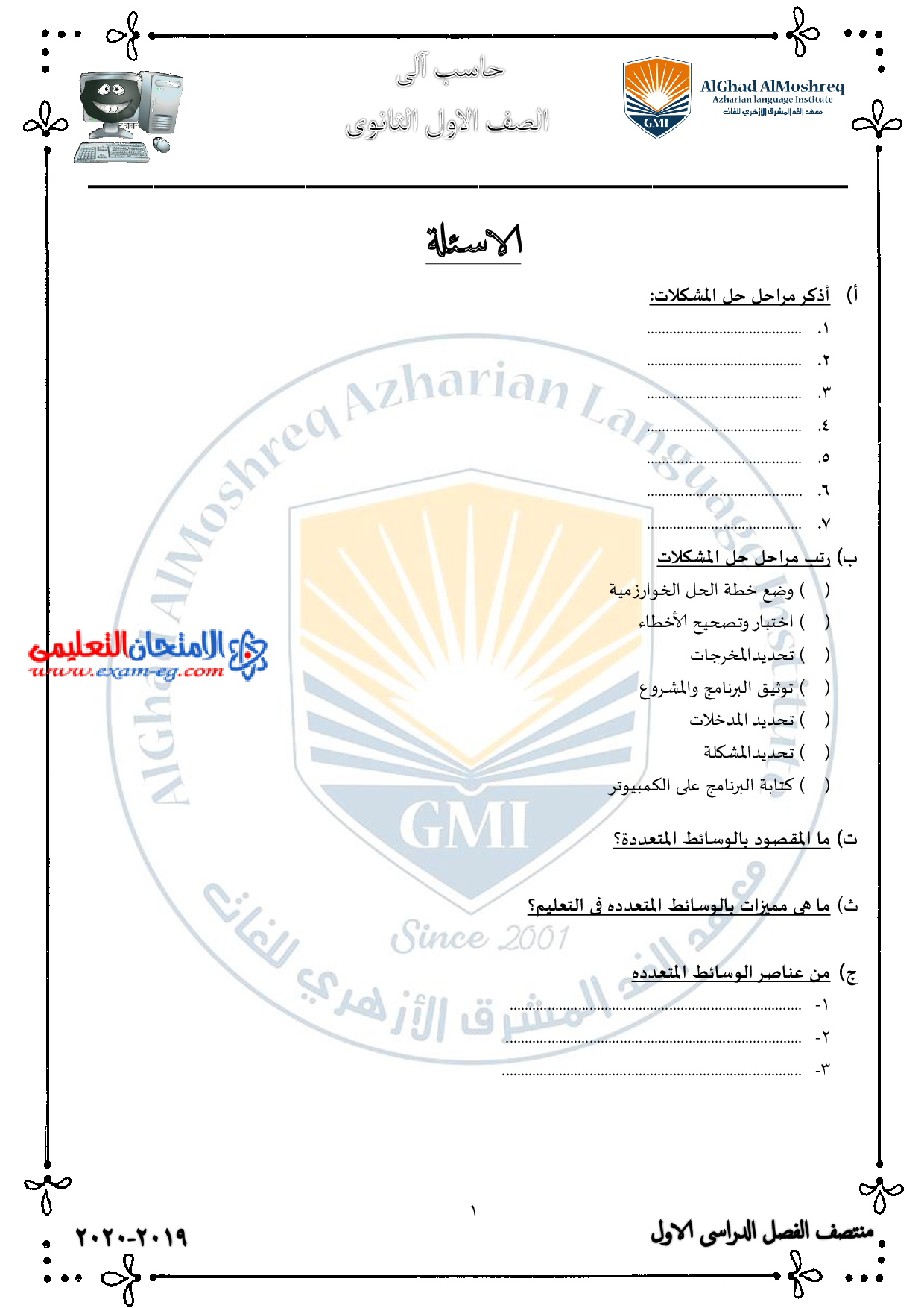 اسئلة اختبار واجاباتها مادة الحاسب الالي للصف الاول الثانوي مقررات