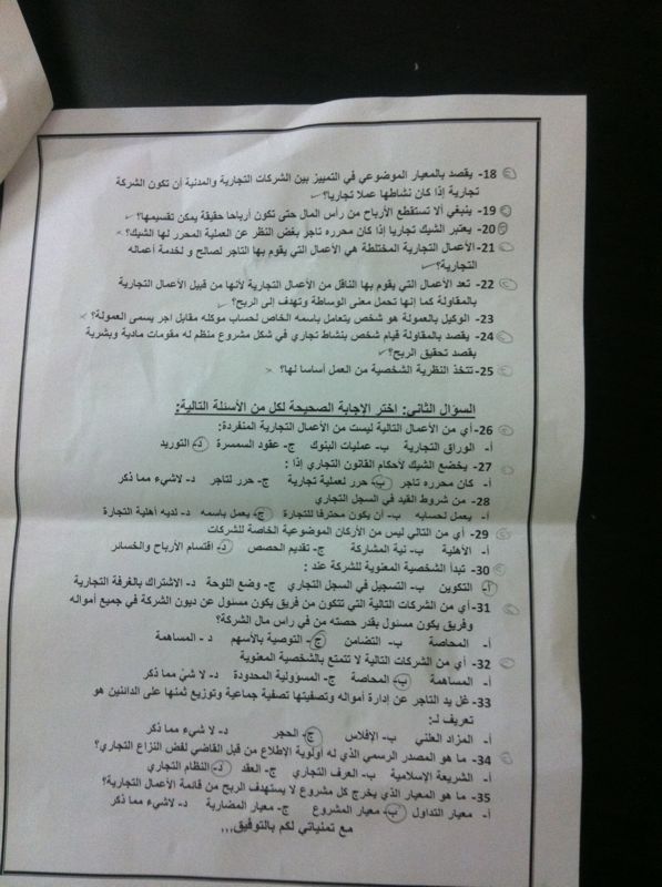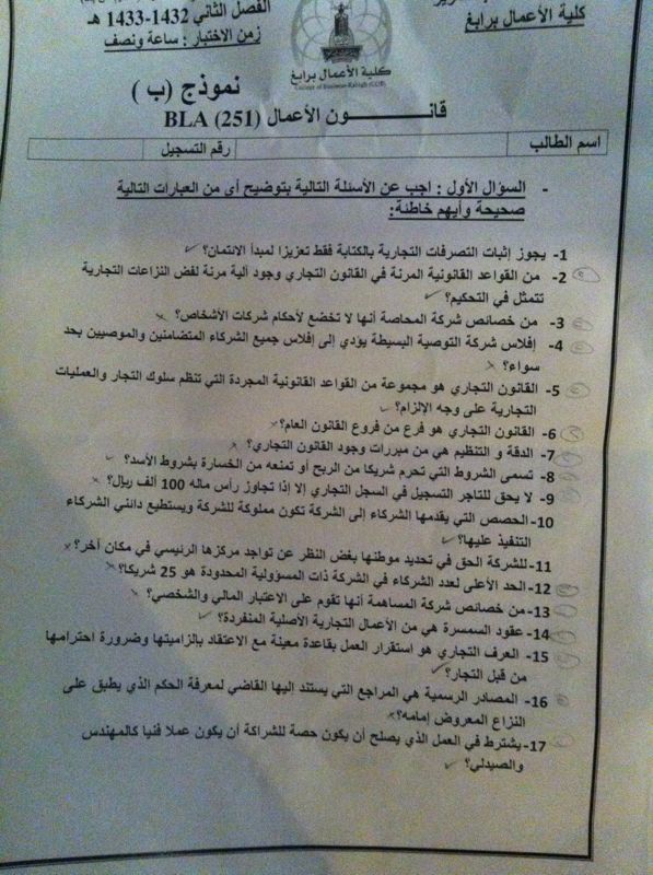 اسئلة مادة قانون الأعمال bla 251 انتساب الفصل الدراسي الثاني 1433هـ نموذج (ب)