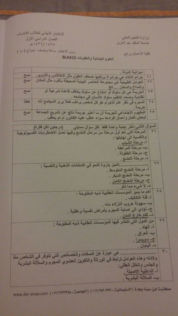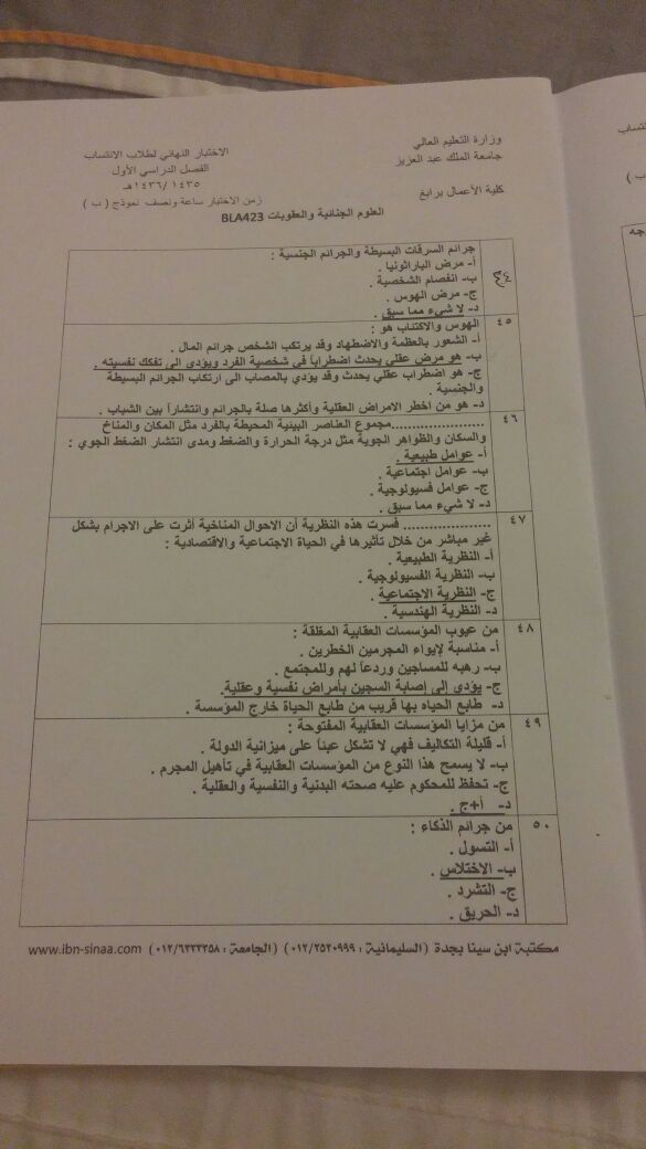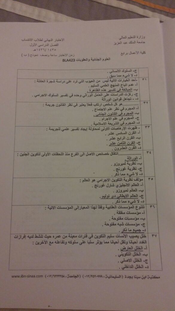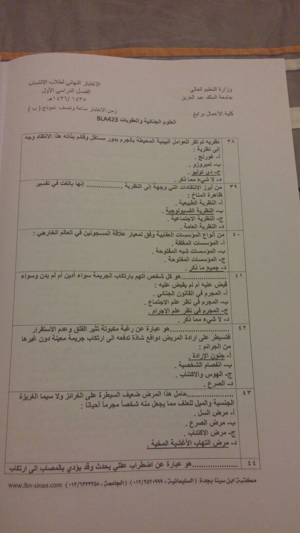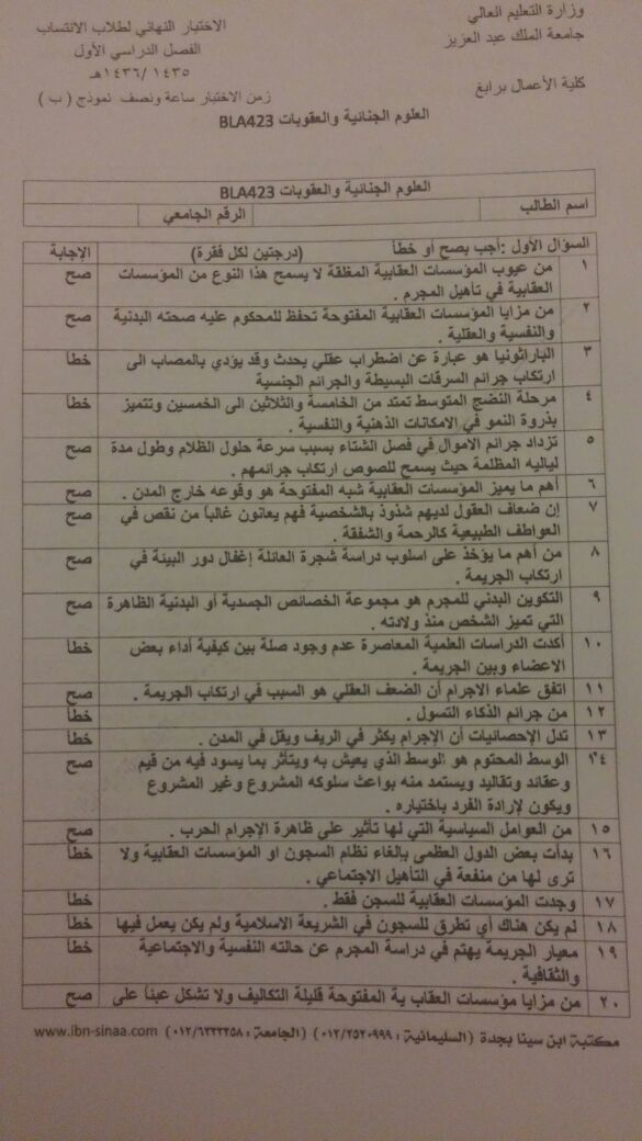 اسئلة اختبار العلوم الجنائية والعقوبات BLA 423 انتساب الفصل الأول 1436هـ نموذج (ب)