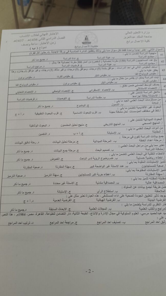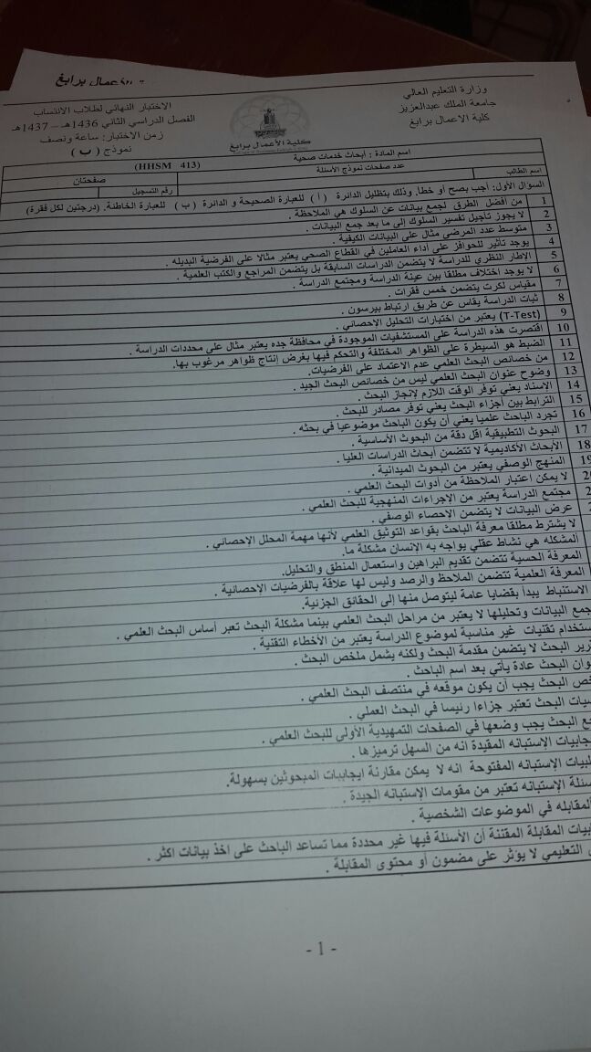 اختبار أبحاث خدمات صحية HHSM 413 الفصـل الثاني 1437هـ نموذج ب