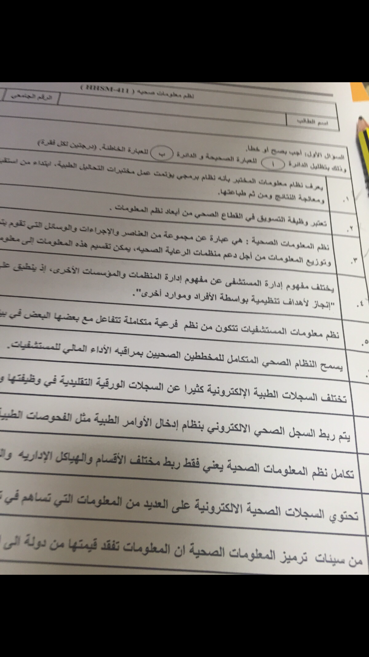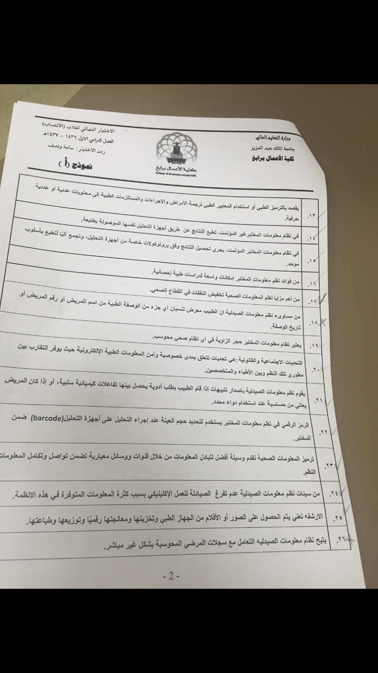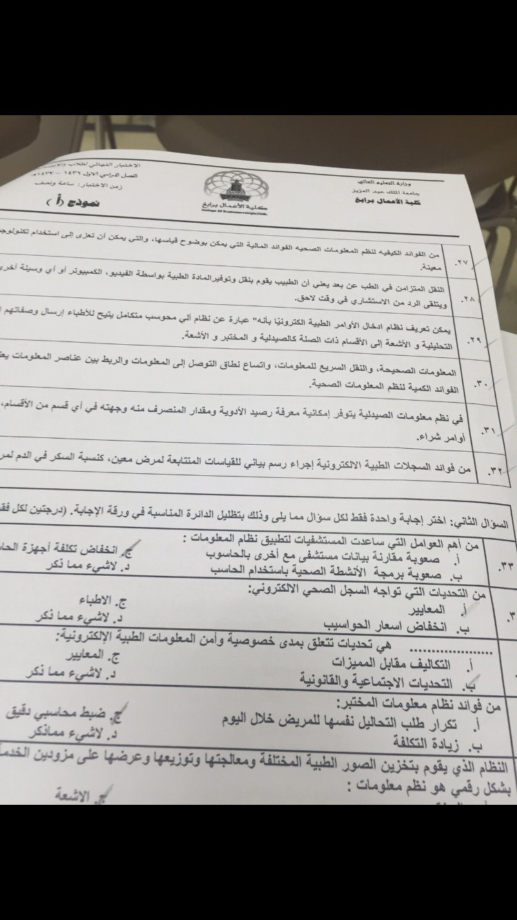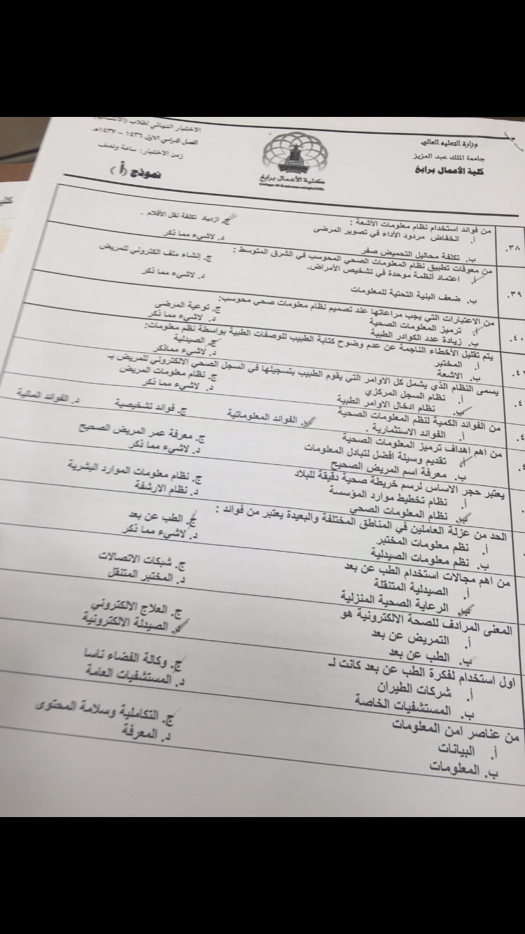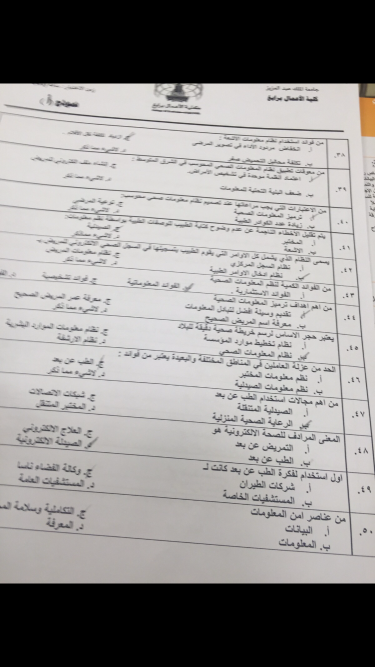 اسئلة اختبار نظم معلومات صحية HHSM 411 انتساب الفصل الأول 1437هـ نموذج أ