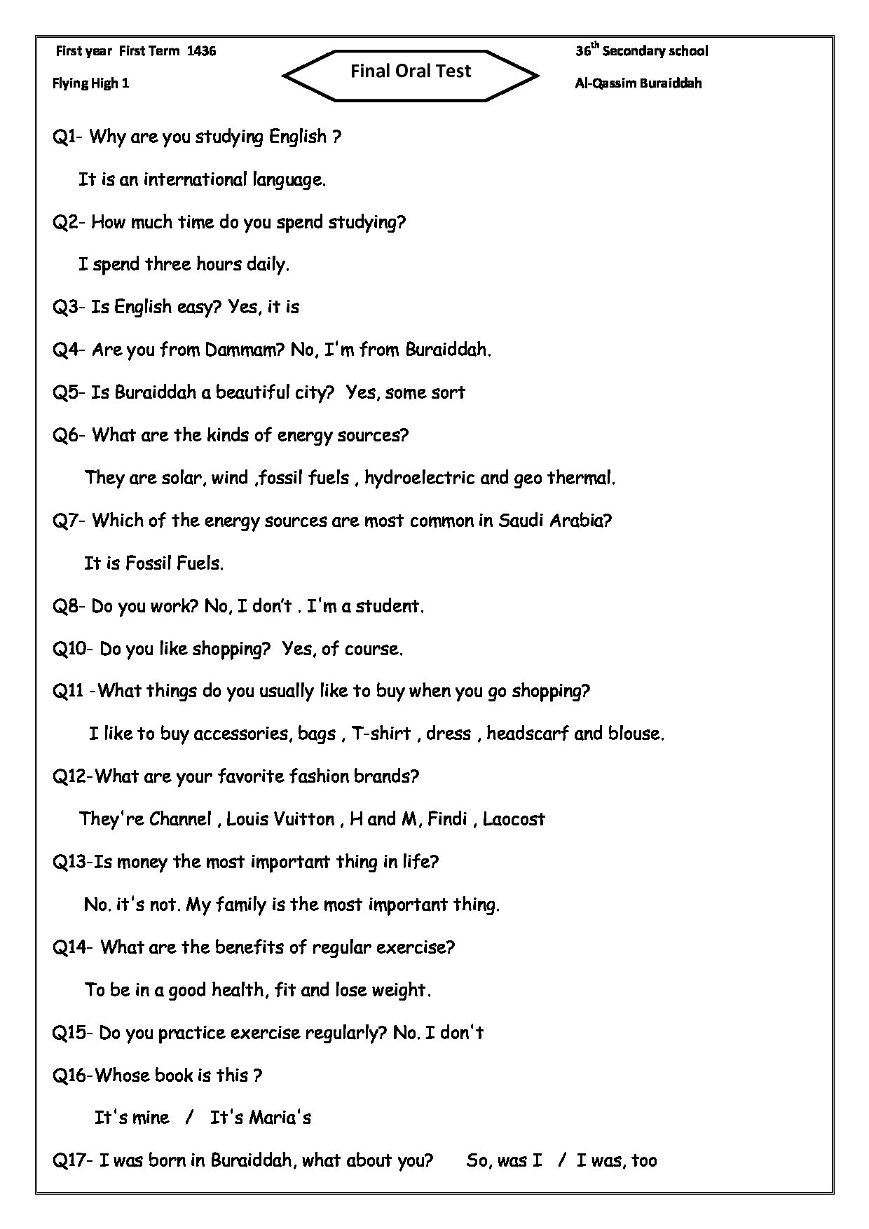اسئلة مراجعه للاختبار الشفوي Flying High للصف الاول ثانوي مقررات الفصل الثاني