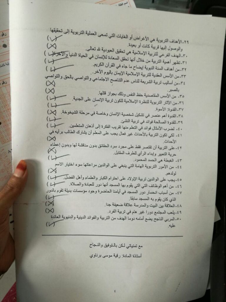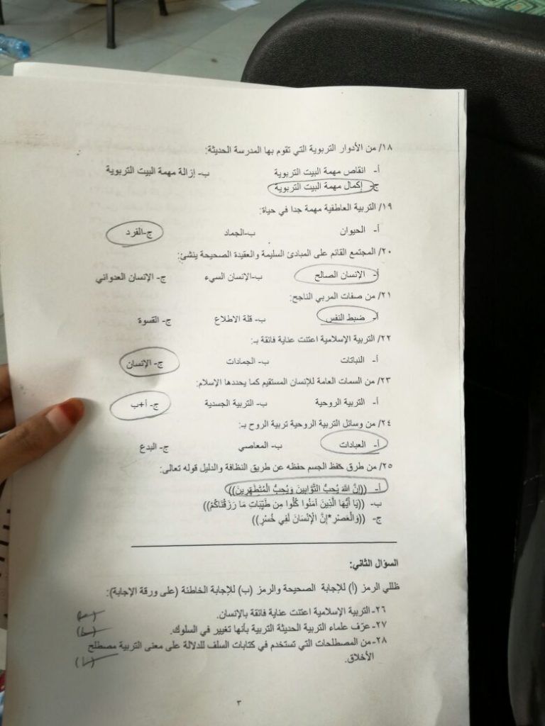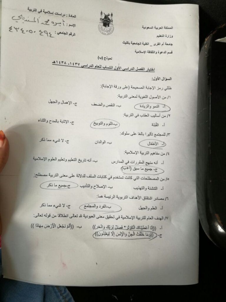 اختبار دراسات إسلامية في التربية الفصل الاول 1438هـ