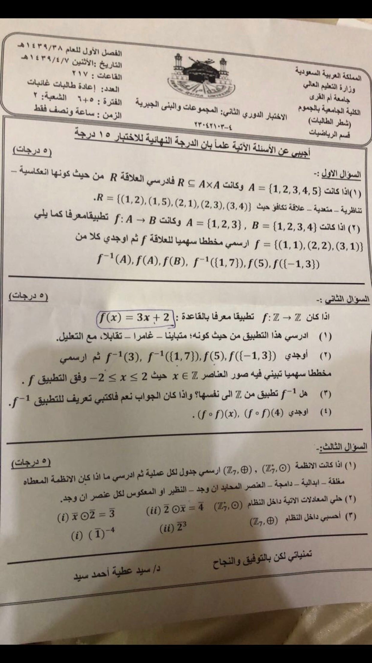 اختبار الدوري الثاني لمدخل البنى الجبرية 1439