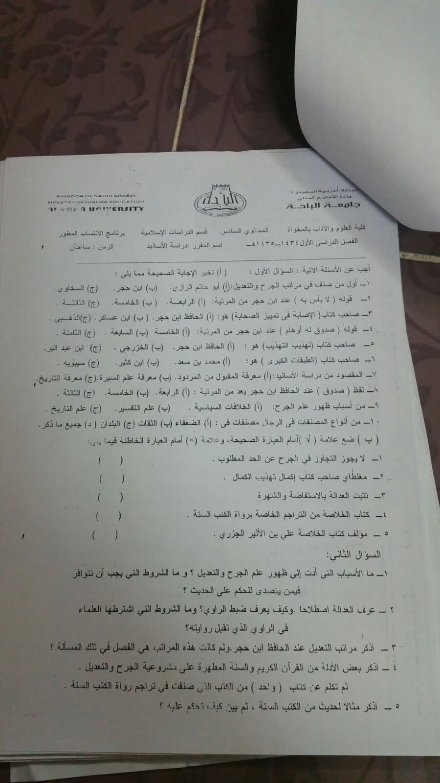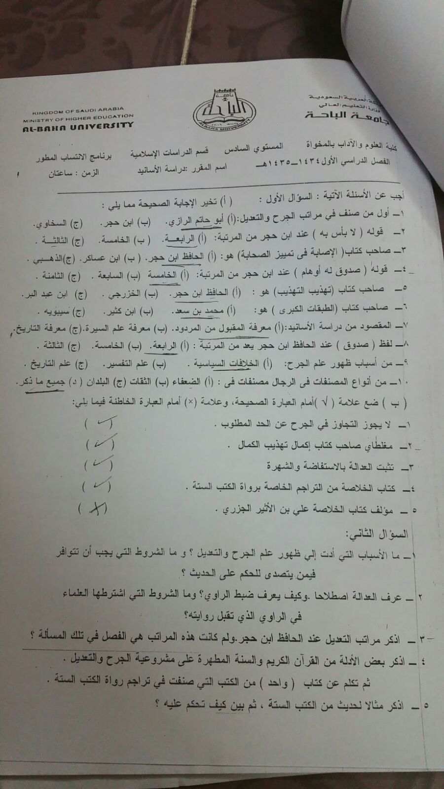 اختبار دراسة الأسانيد الفصل الأول 1435هـ المستوى السادس