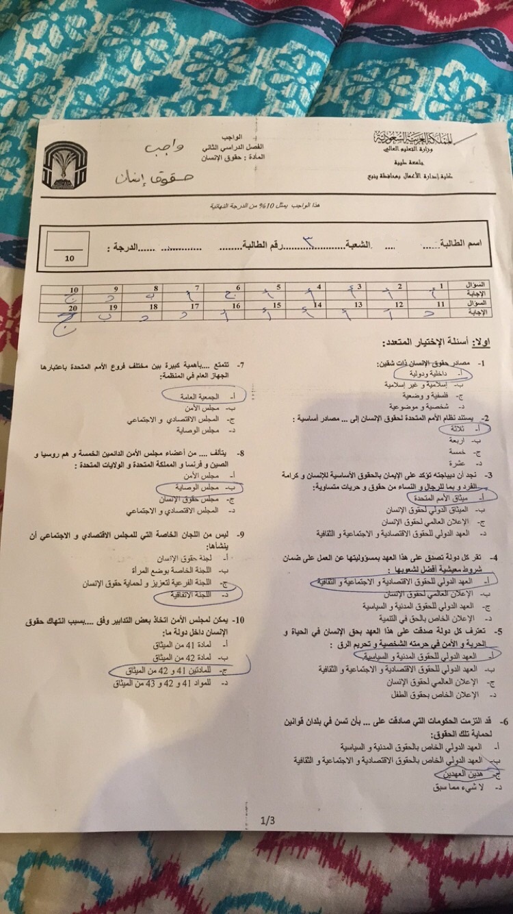 اسئلة اختبار ميد ترم 2 حقوق الانسان بكلية إدارة الاعمال بمحافظة ينبع