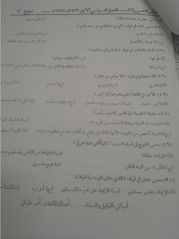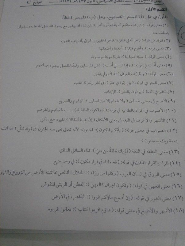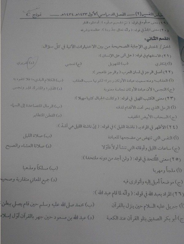 اسئلة اختبار مادة التفسير 2 الفصل الدراسي الأول 1434هـ نموذج (C)