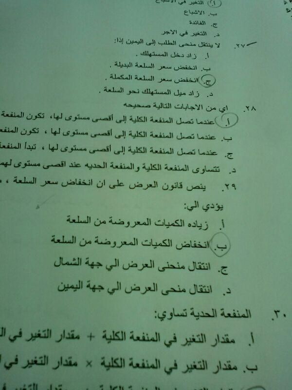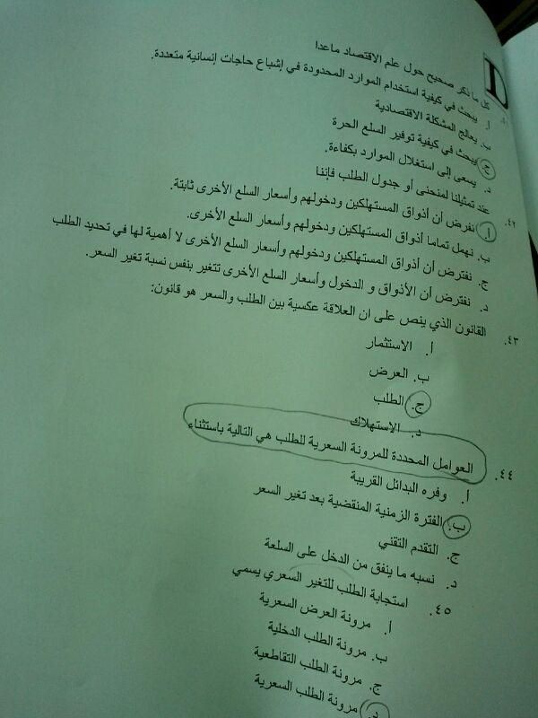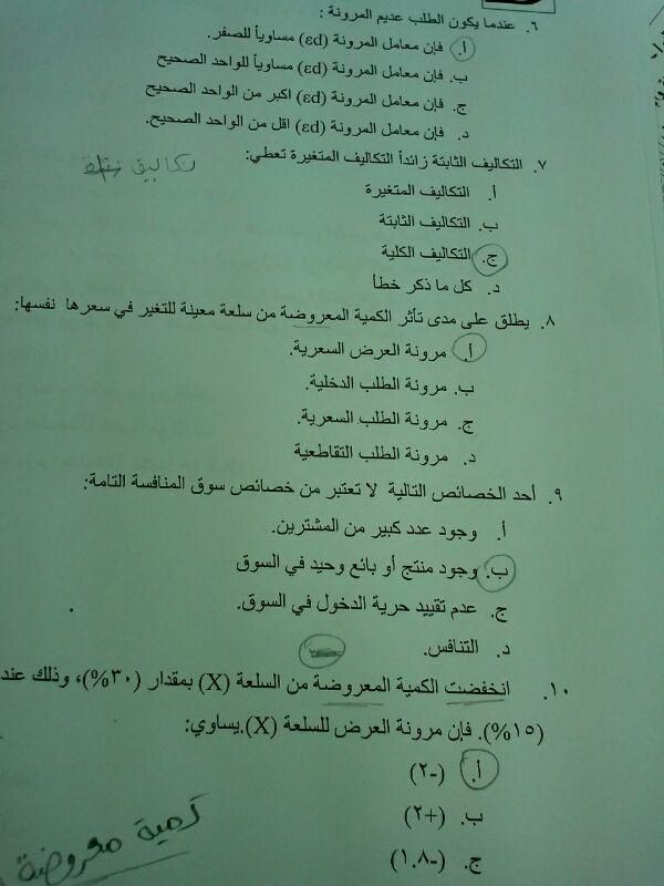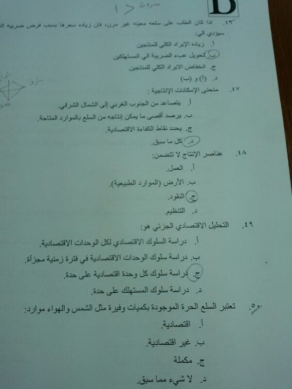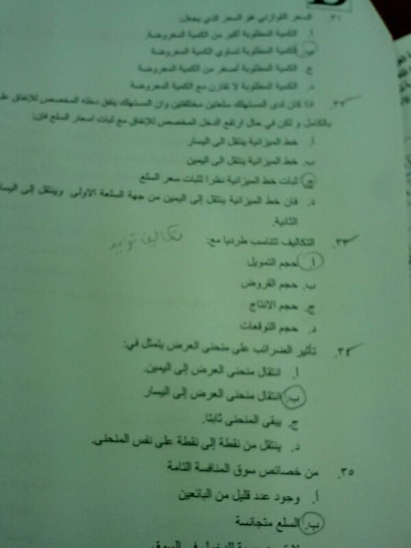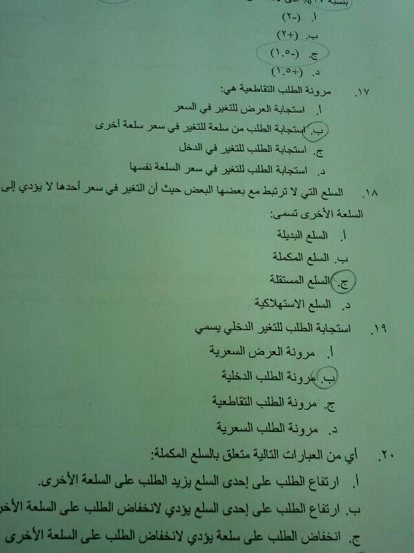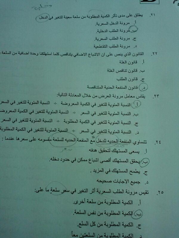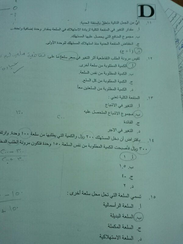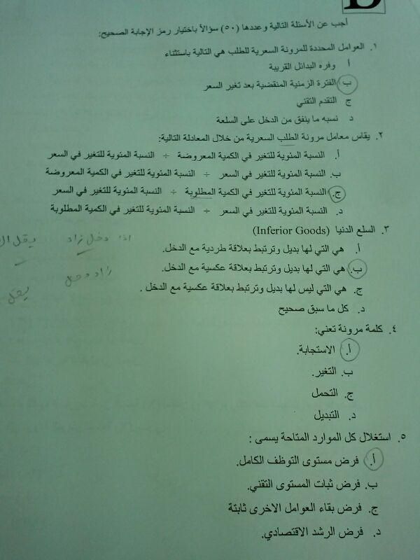 اسئلة اختبار مادة مبادئ الاقتصاد الجزئي نموذج (D)