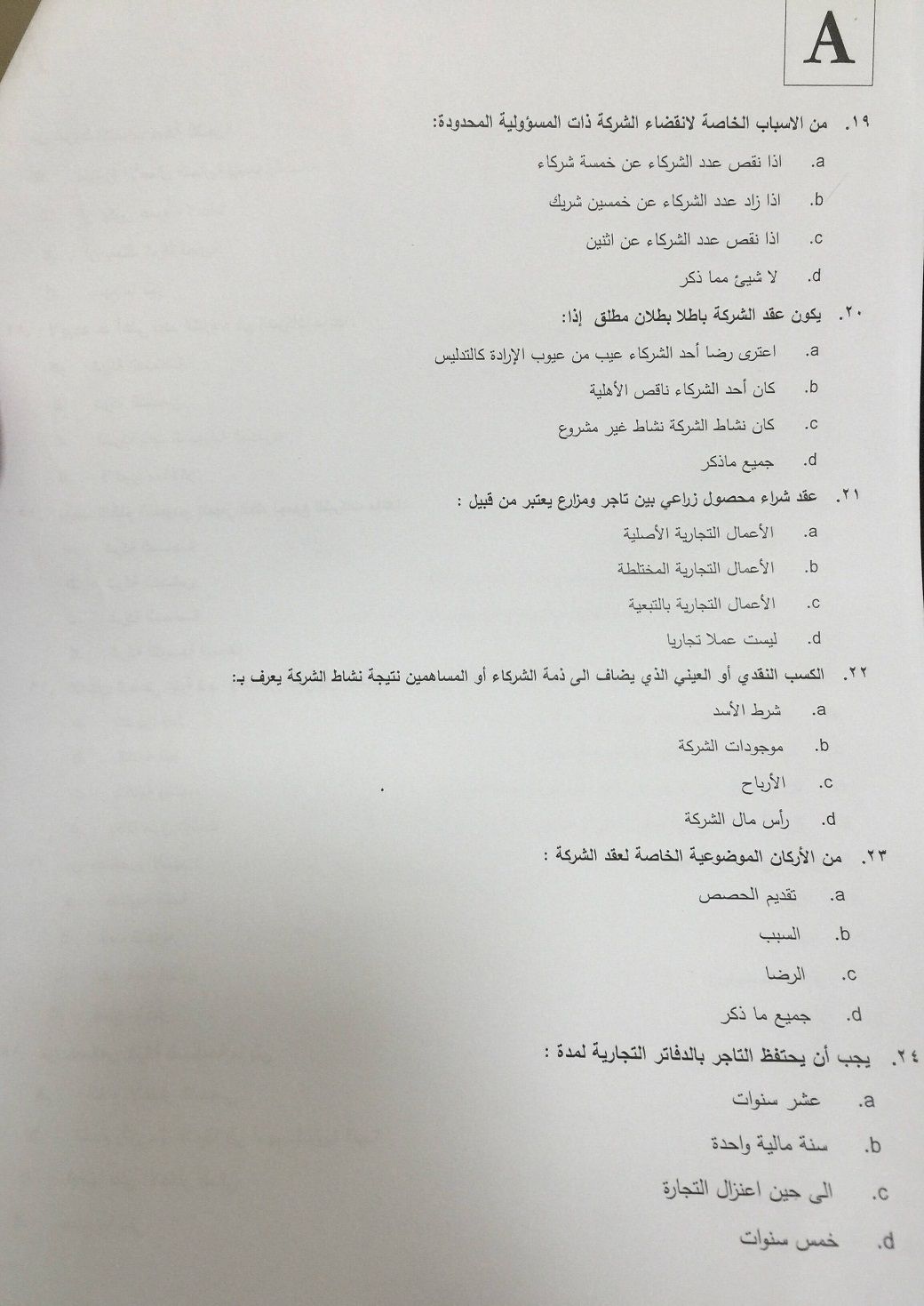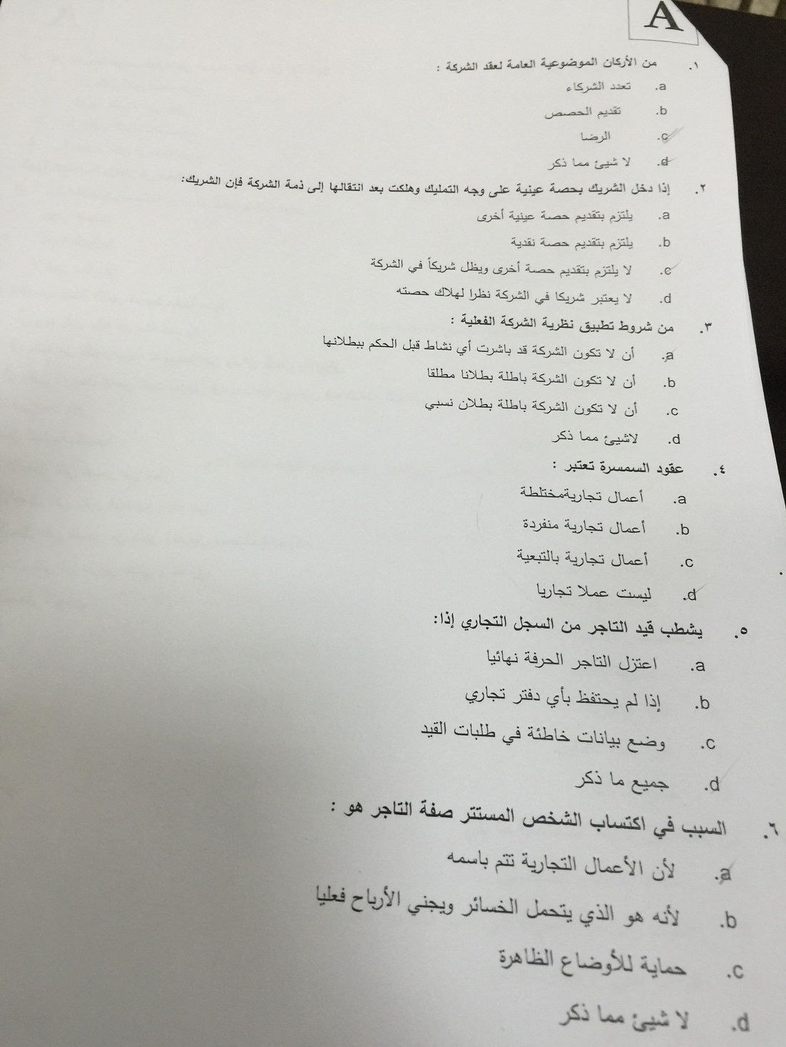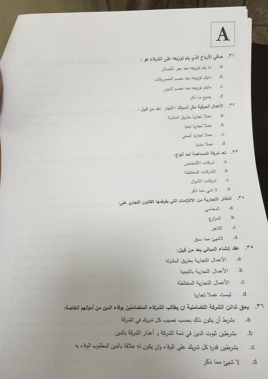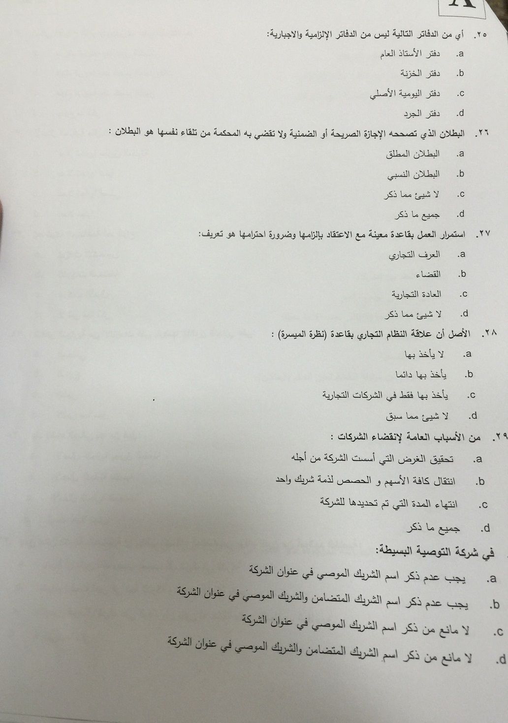 اسئلة اختبار القانون التجاري الفصل الدراسي الأول 1436هـ نموذج (A)