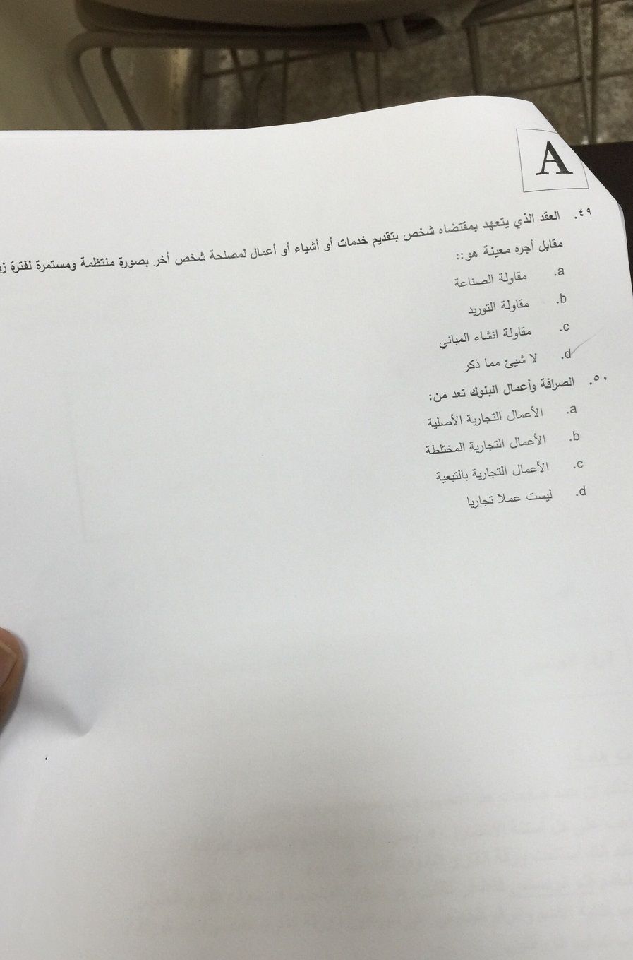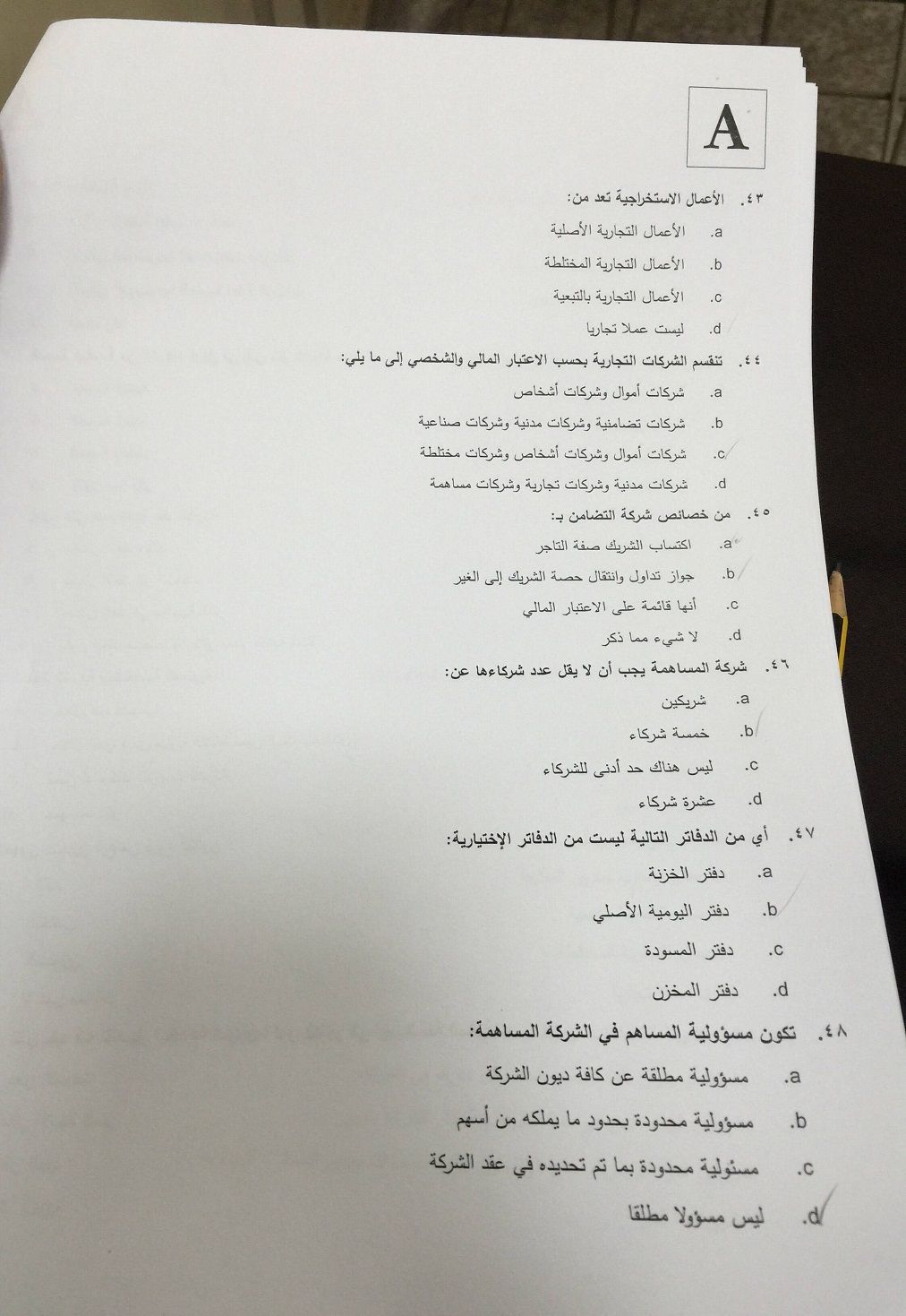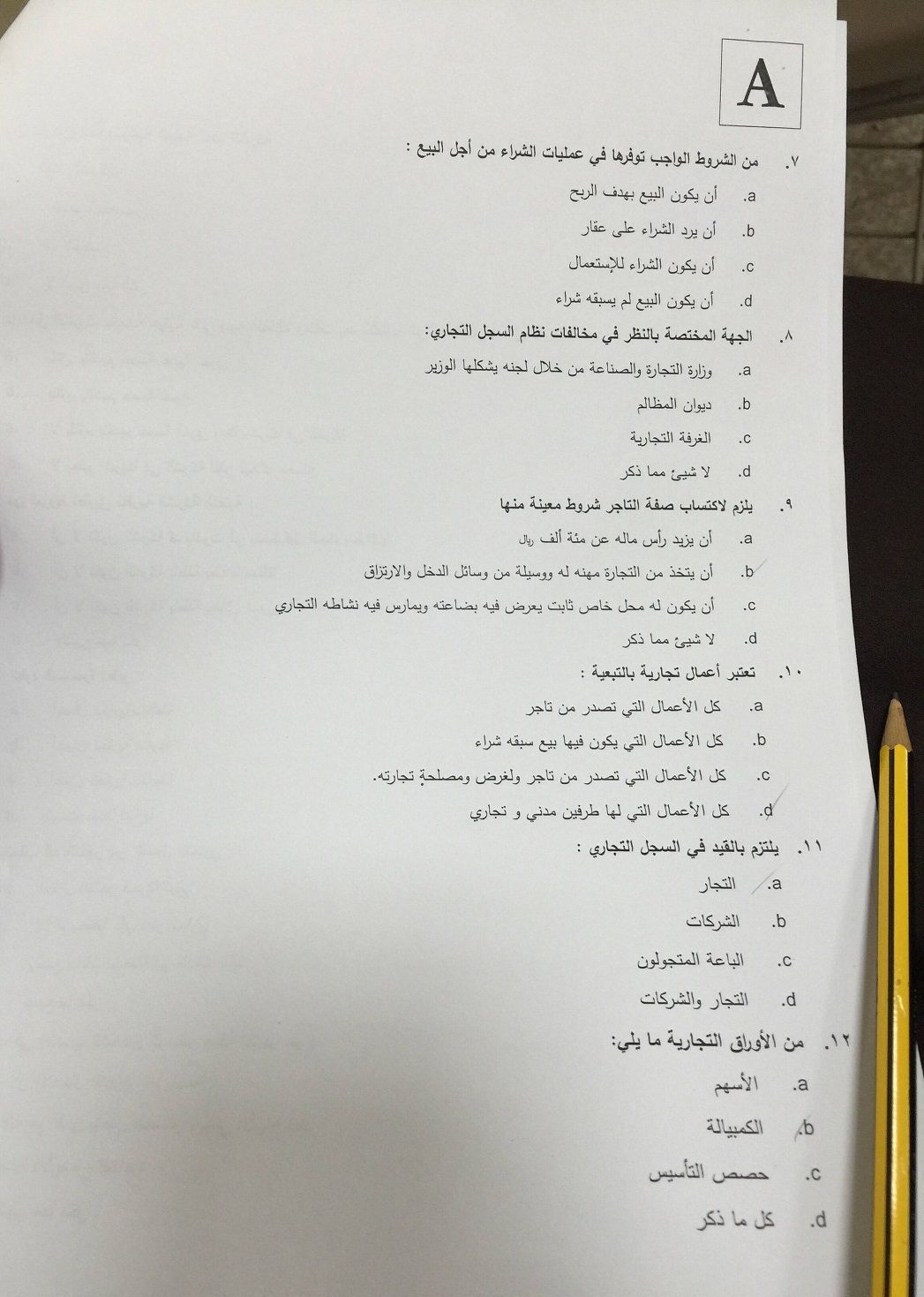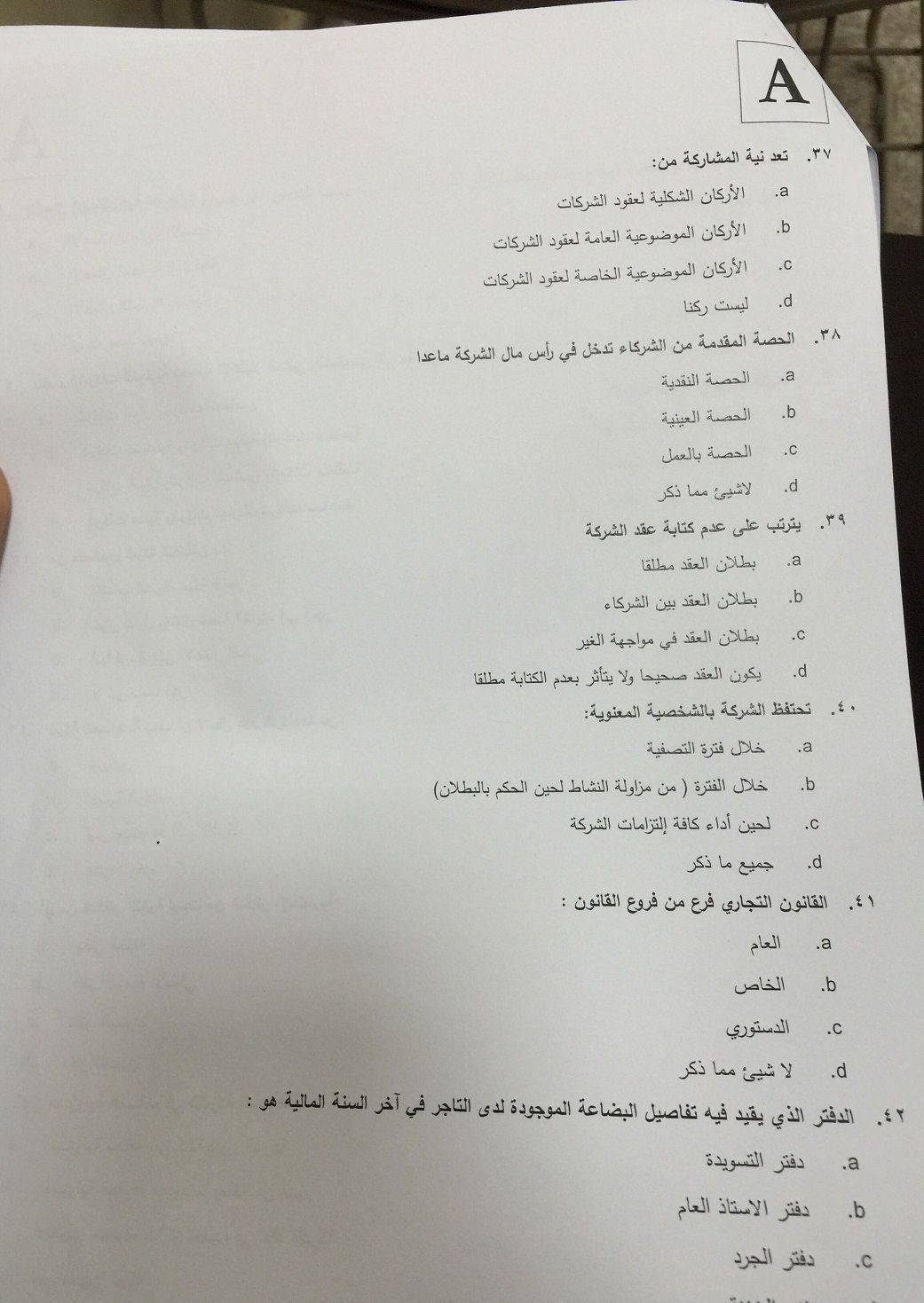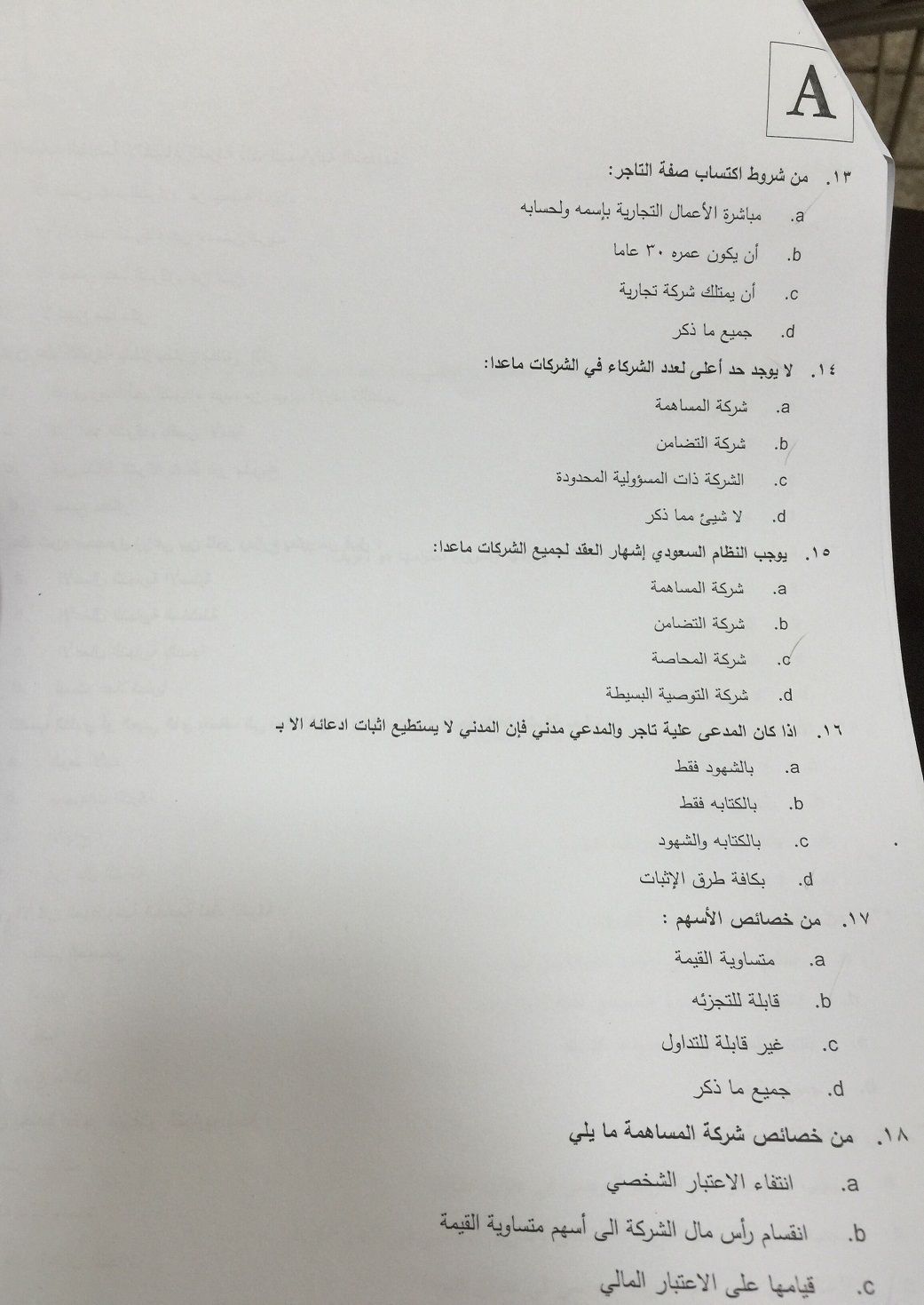 اسئلة اختبار القانون التجاري الفصل الدراسي الأول 1436هـ نموذج (A)