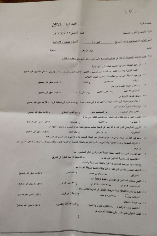 اسئلة اختبار مادة علوم الحديث (1) الفصل الدراسي الأول 1434هـ نموذج (ج)