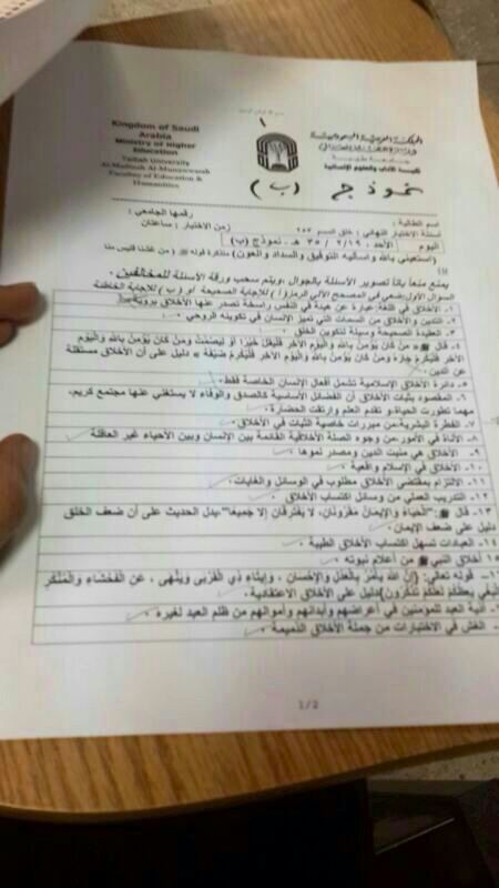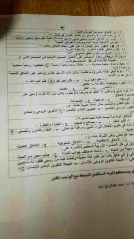 اسئلة اختبار مادة خلق المسلم الفصل الدراسي الأول 1435هـ نموذج (ب)