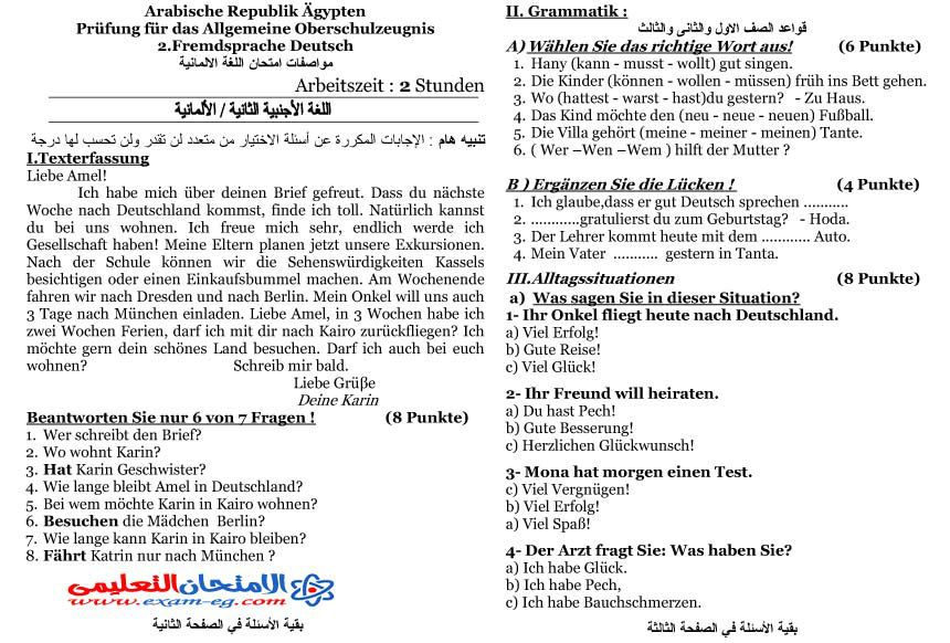 اسئلة اختبار اللغة المانية الصف الثالث الثانوي 2017 - نموذج ب - الفصل الدراسي الثاني