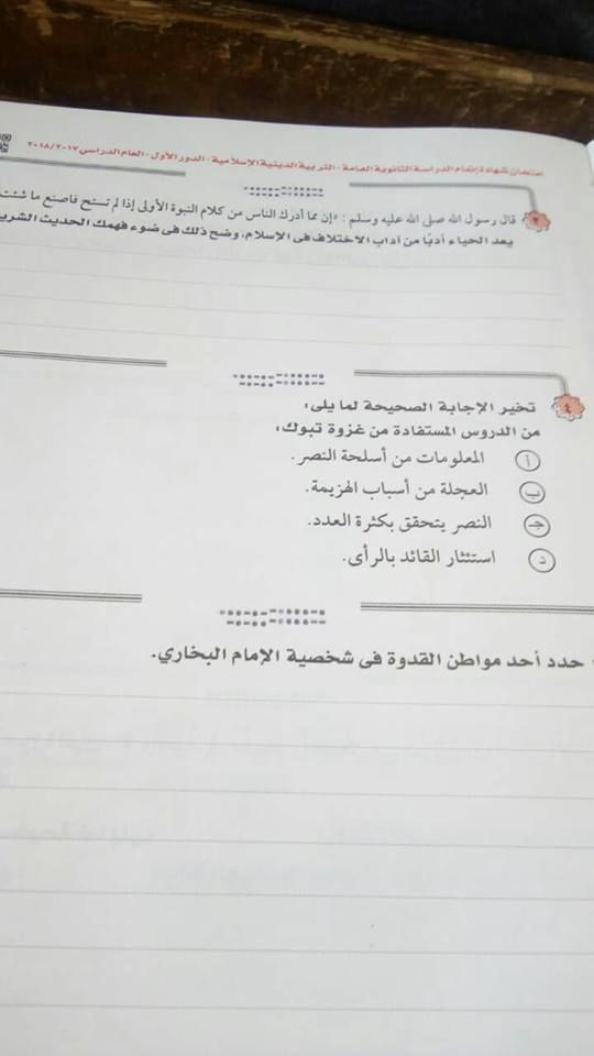اختبار نهائي لمادة التربية الإسلامية للصف الثالث الثانوي للعام الدراسي 2017 - نموذج ب