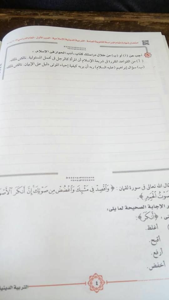 اختبار نهائي لمادة اللغة التربية الاسلامية للصف الثالث الثانوي للعام الدراسي 2018 - نموذج أ