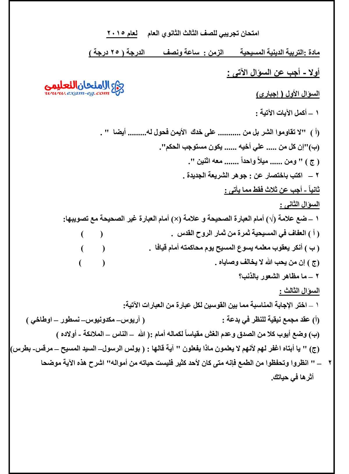 اسئلة اختبار التربية المسيحية الصف الثالث الثانوي لفصل الدراسي الثاني.jpg