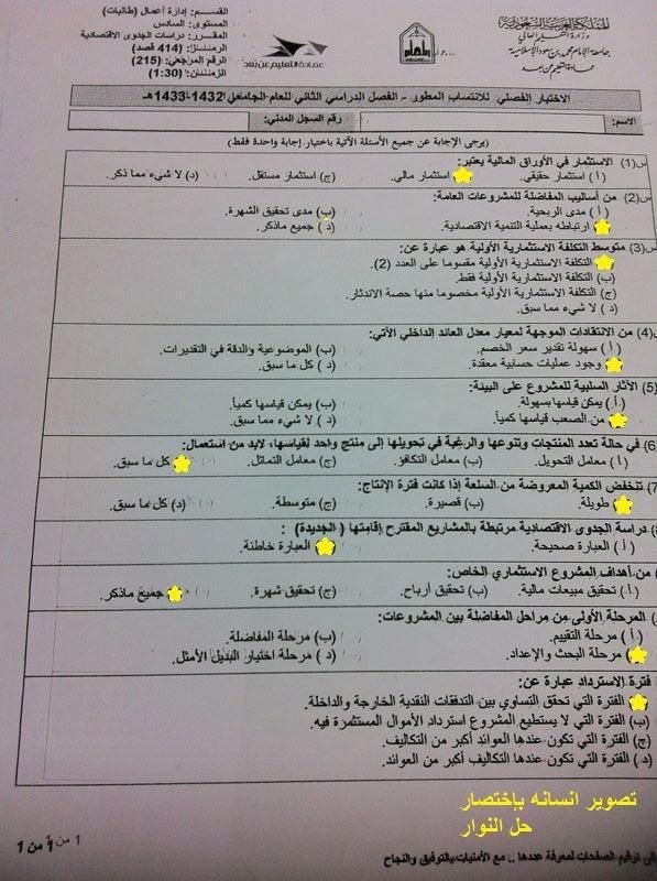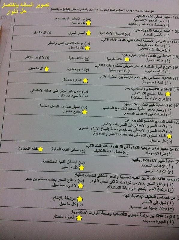 اسئلة مادة دراسات الجدوى الإقتصادية قصد 414 الفصل الدراسي