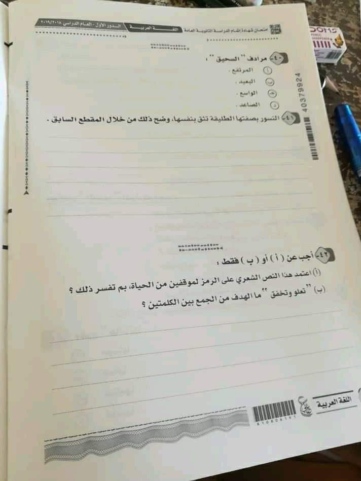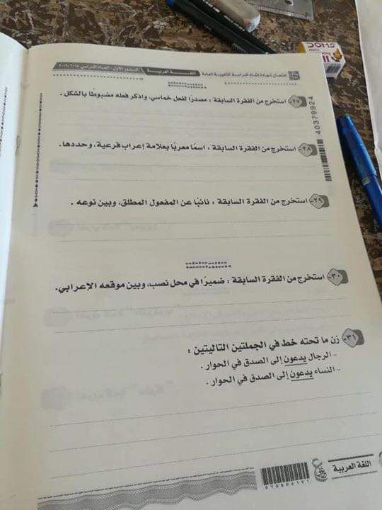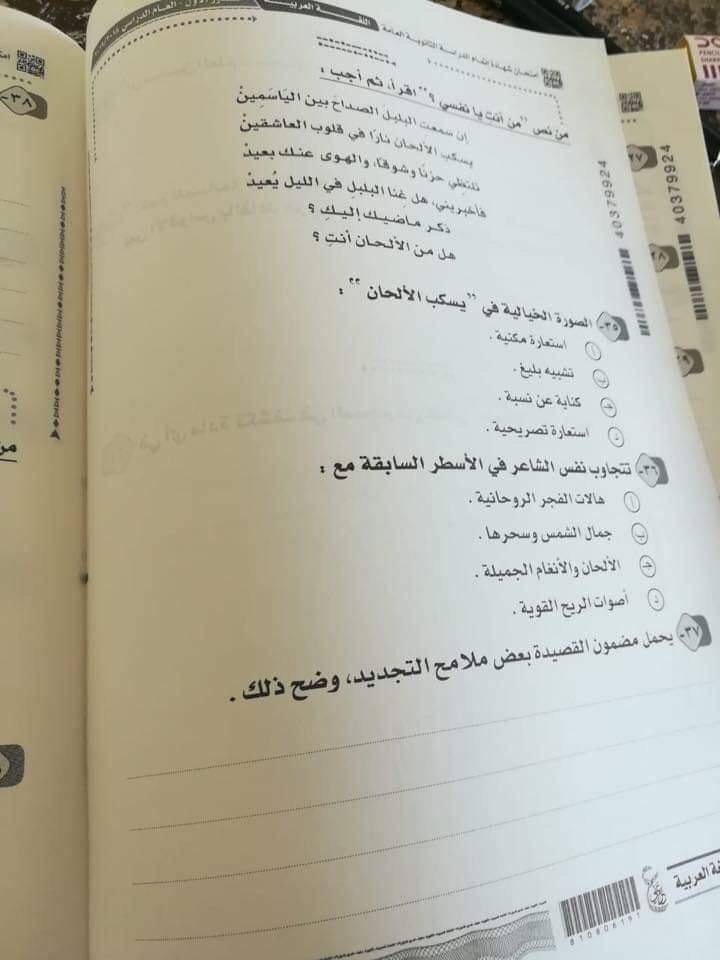 اسئلة اختبار اللغة العربية الصف الثالث الثانوي 2017 - نموذج 4- الفصل الدراسي الثاني
