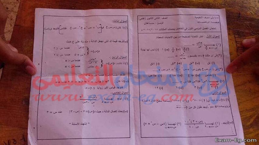 اسئلة اختبار الرياضيات العامة ( التفاضل والتكامل) لتانية ثانوى أدبي الترم الاول 2016 - بنى سويف